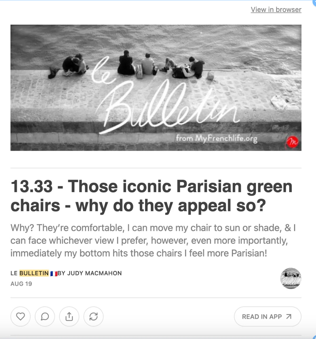 If you’re enjoying this ‘le Bulletin’ please consider providing support for my work by upgrading to a paid subscription it’s surprisingly inexpensive - Merci. Judy - 26.8.23