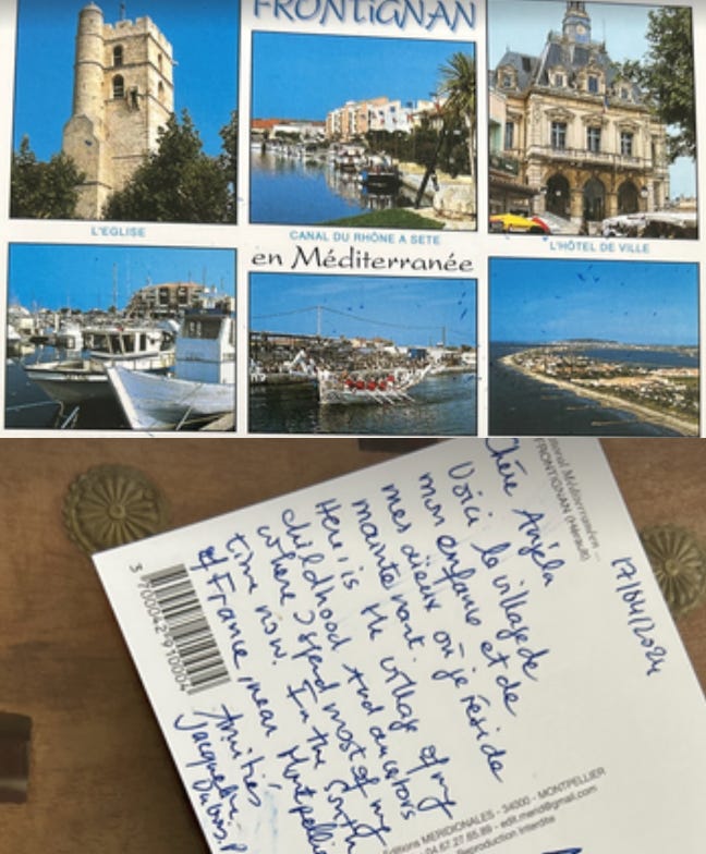 “I sent my postcard already (to Australia !) Frontignan is the town in the South of France where I grew up. “ says