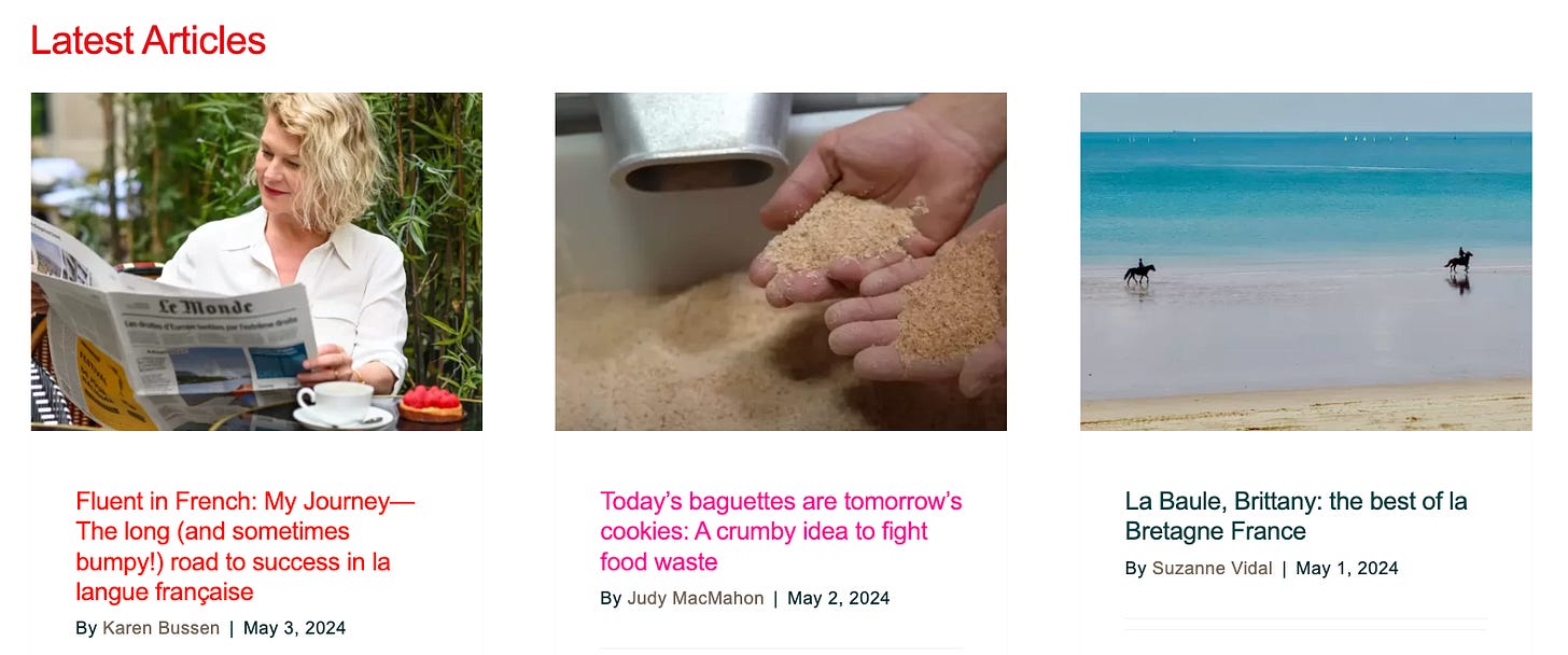 I’m publishing new articles weekly in our Magazine—too many to feature here individually as I used to do…so… I’ve made a few changes to help you find the articles. You’ll now find these fresh articles by clicking the MyFrenchLife Magazine LOGO at the base of this newsletter.