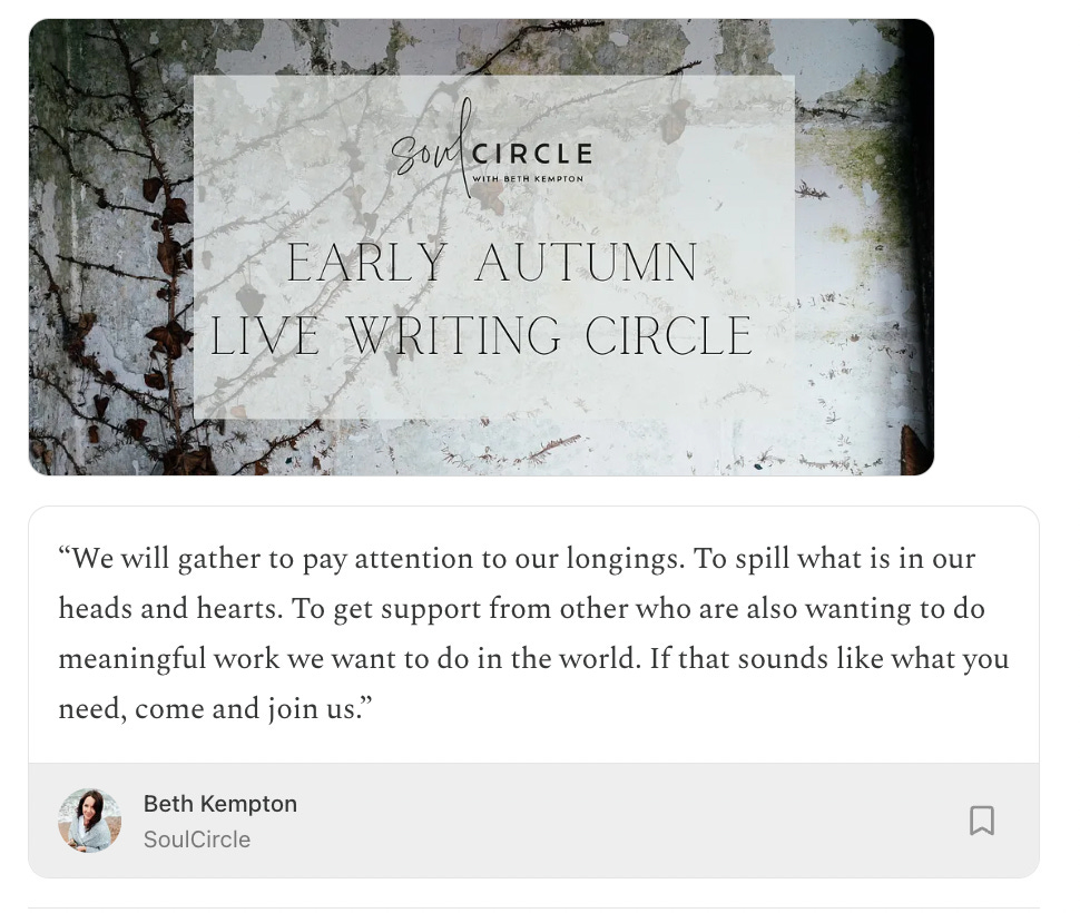 g) “I never want to wish time away but I’d be lying if I said I wasn’t thrilled to sense autumn in the air…” wrote the author as she announced a live writing circle.