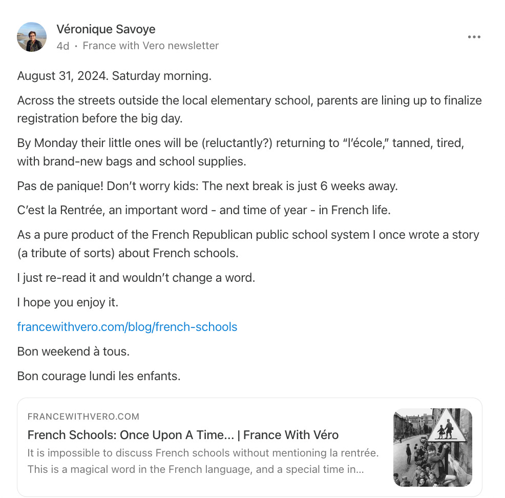 b) What is le Rentrée? Véronique explains this & French schools… [note & article]