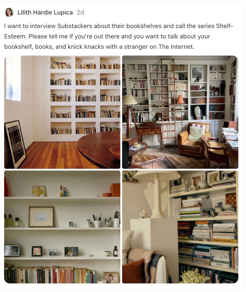 Then, once again I ran full-on into this fabulous post by Lilith Hardie Lupica in her substack ‘Have a Nice Book’ - a call for her new Shelf-Esteem project.
