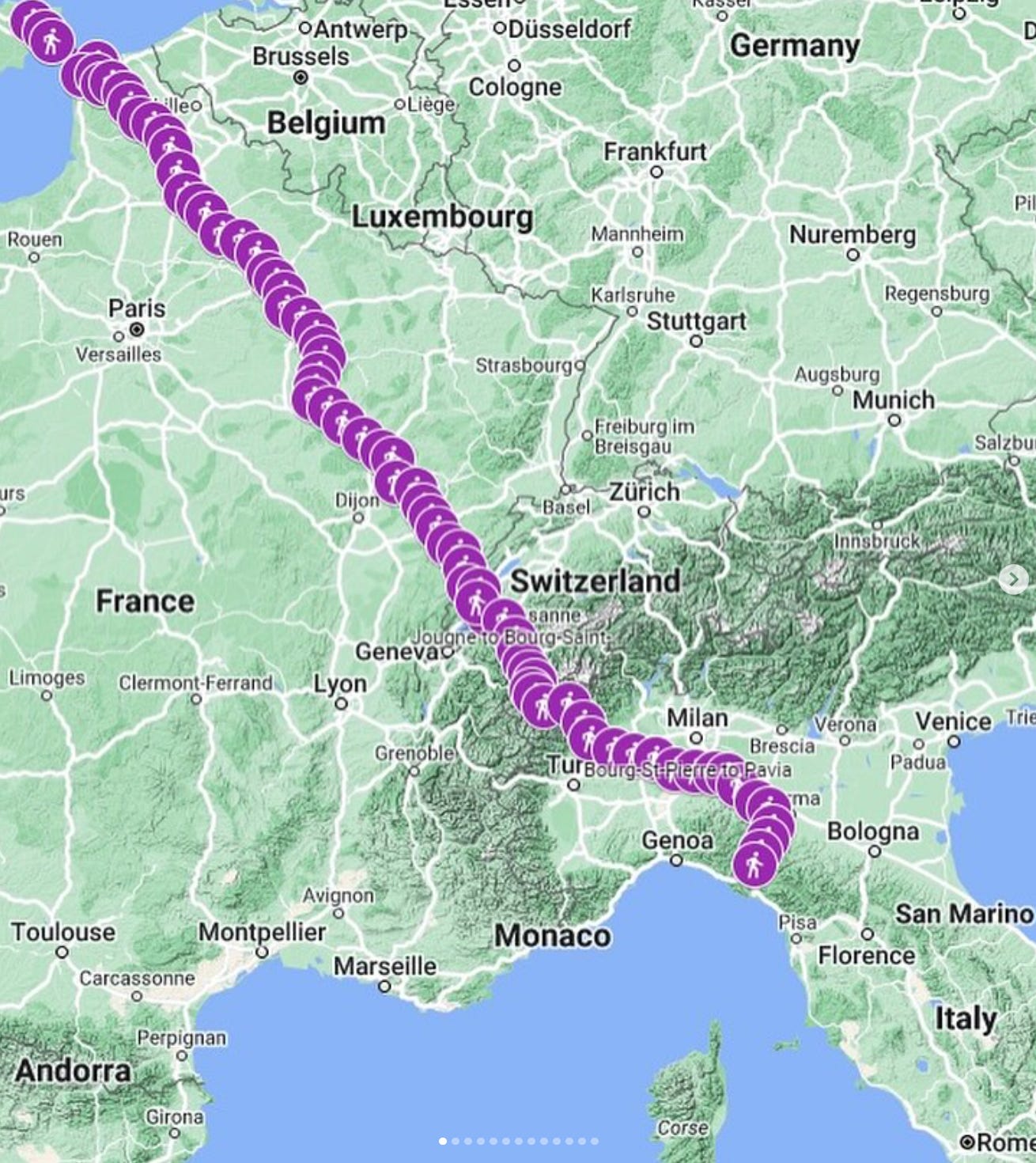 Here she is after 82 days… having crossed the St Bernard Pass, (the third highest) from Switzerland to Italy, then on to the university town of Pavia… then south, then west toward the coast at Pontremoli, then, onward toward Roma. You can read the details in her weekly guest post on our Instagram account @maviefrancaise