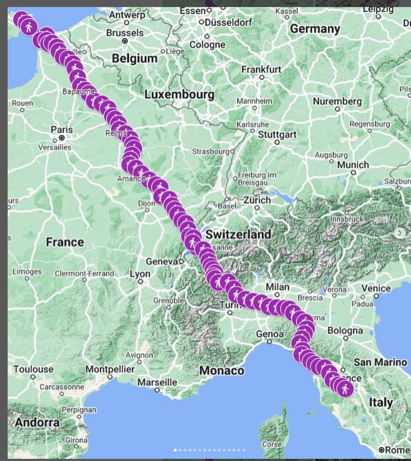 Having crossed northern France, then the St Bernard Pass, (the third highest) from Switzerland to Italy today a rest day in Sienna then onward toward Roma. You can read the details in her weekly guest post on our Instagram account @maviefrancaise