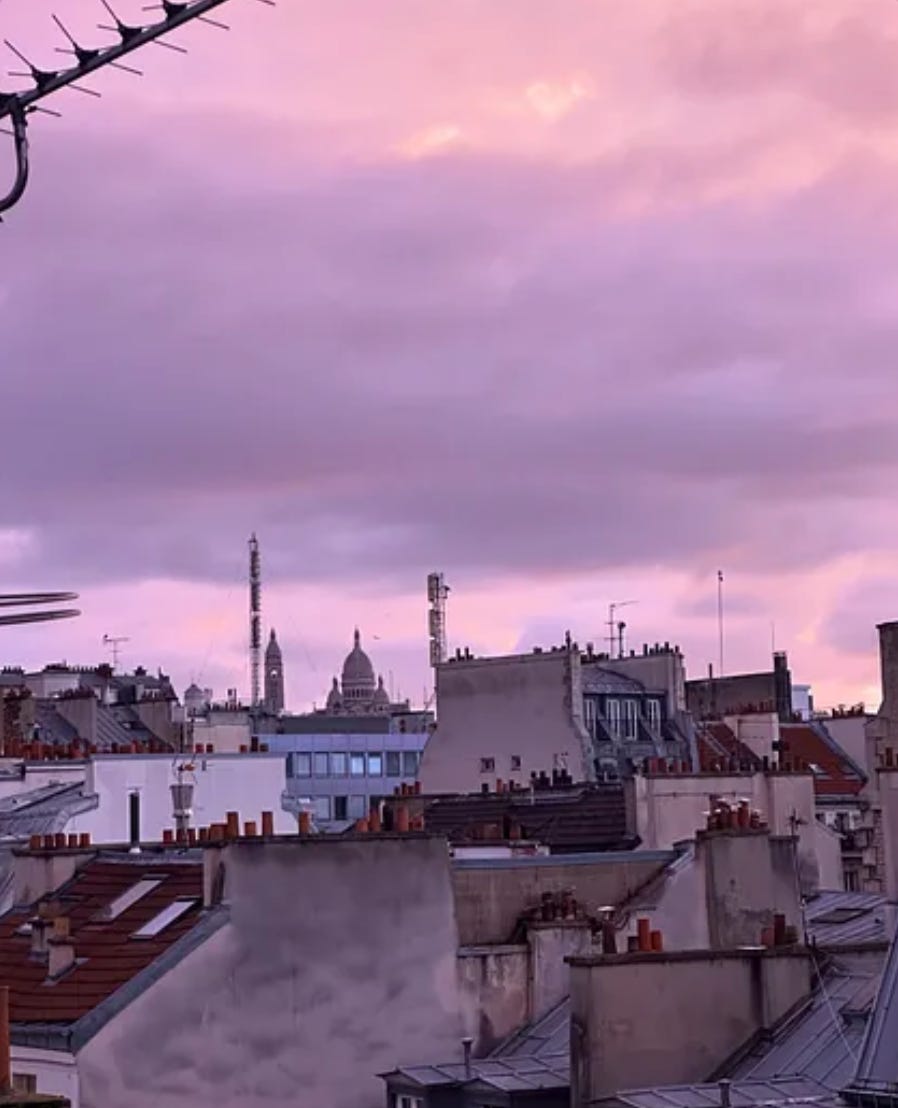 purple sunrise with Sacre Coeur in the distance.