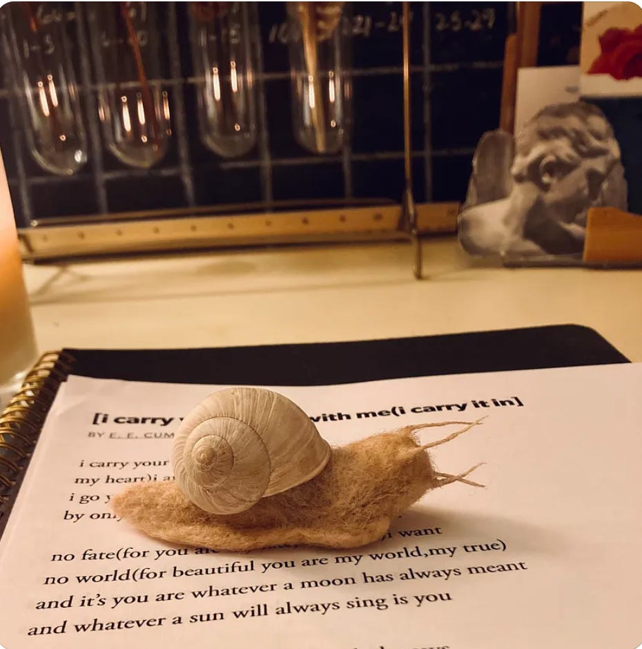 This morning i was gifted a hand-felted snail. i will now faint from the sheer joy of its presence 🐌