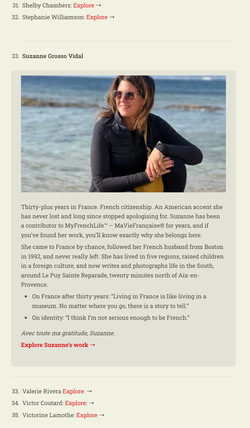 From now on, as I build out our Contributors page on the site, each contributor will have a proper profile: who they are, with the best of what they’ve shared about their life and France. And each time I add another contributor, I’ll introduce them here, in the FREE edition.