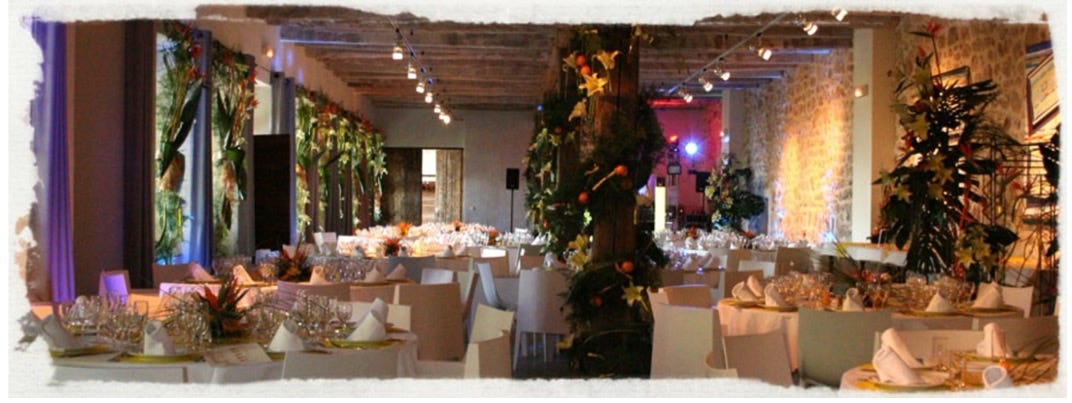 “On y va!” said Patrick and Jocelyne, and we followed them into the huge dining hall of the Magnanerie. Inside, twinkle lights sparkled on the medieval timbers, and mellow stone walls hung with mistletoe, pine boughs, and ornaments. It was the perfect place to make merry on an evening named in honor of a Pope who’d died around two thousand years ago.