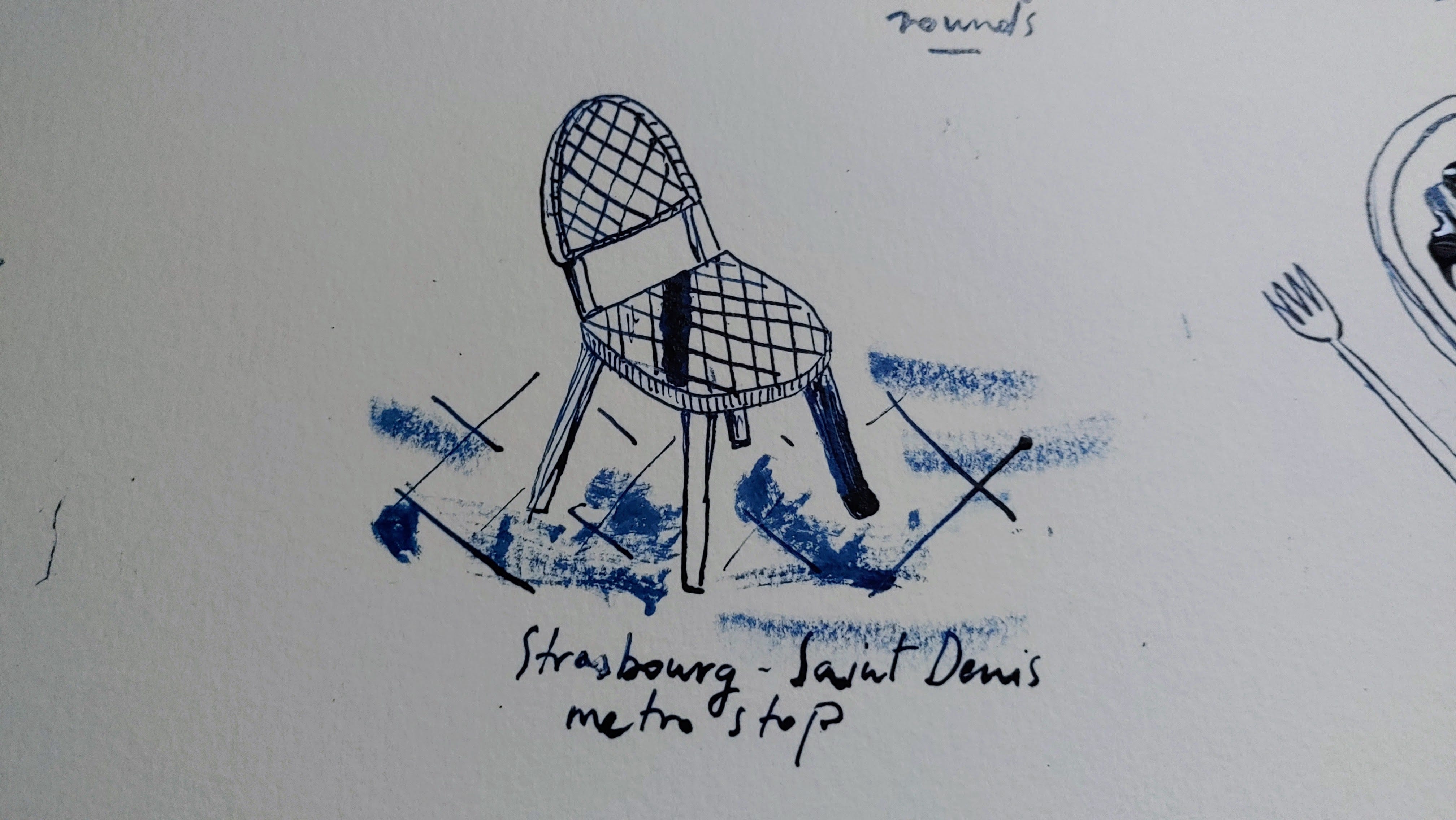 I recorded the sounds and listened to the recording, then I drew what I heard. Here is one of the chairs in the rain.