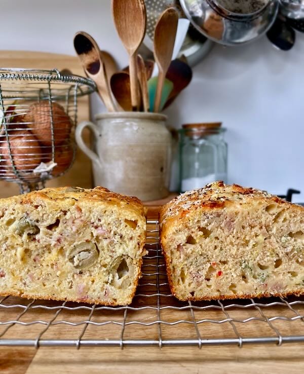 The exception, there is always one, is the French chain of frozen food stores, Picard. The flavours are great, but what I like most is that they’re baked in long, thin loaf pans rather than the usual bread tin. Shape is everything with a cake salé because the browned and slightly crispier crust is the best part; therefore, you want a lot of it. Hence, mini loaf pans or a long, skinny pan will enhance the recipe. Plus, you can easily get bite-sized slices.
