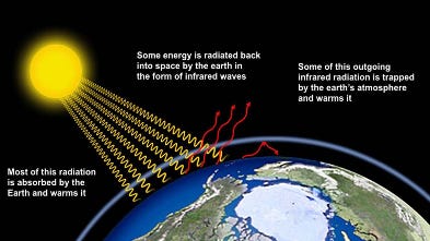 Incoming Heat radiation from the sun penetrates through the atmosphere. Some of this radiation is absorbed by the planet and some is reflected off the Earth’s surface.