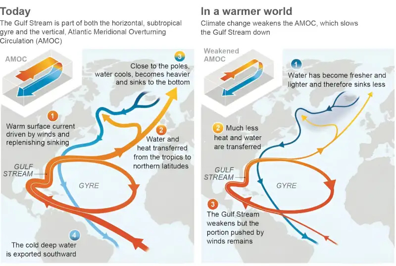 Diagram: How the Atlantic Ocean circulation changes as it slows. IPCC 6th Assessment Report, 17/02/24 https://phys.org/news/2024-02-glaciers-gulf-stream-extreme-climate.amp