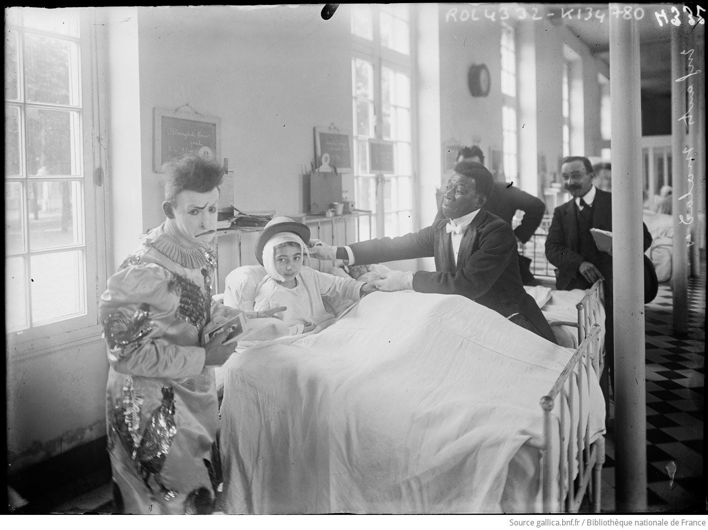 During the time, Chocolat would also visit sick children in local hospitals to cheer them up, for which he was awarded a medal of merit. Here he is in a Paris hospital with a clown named Orlando Averino: