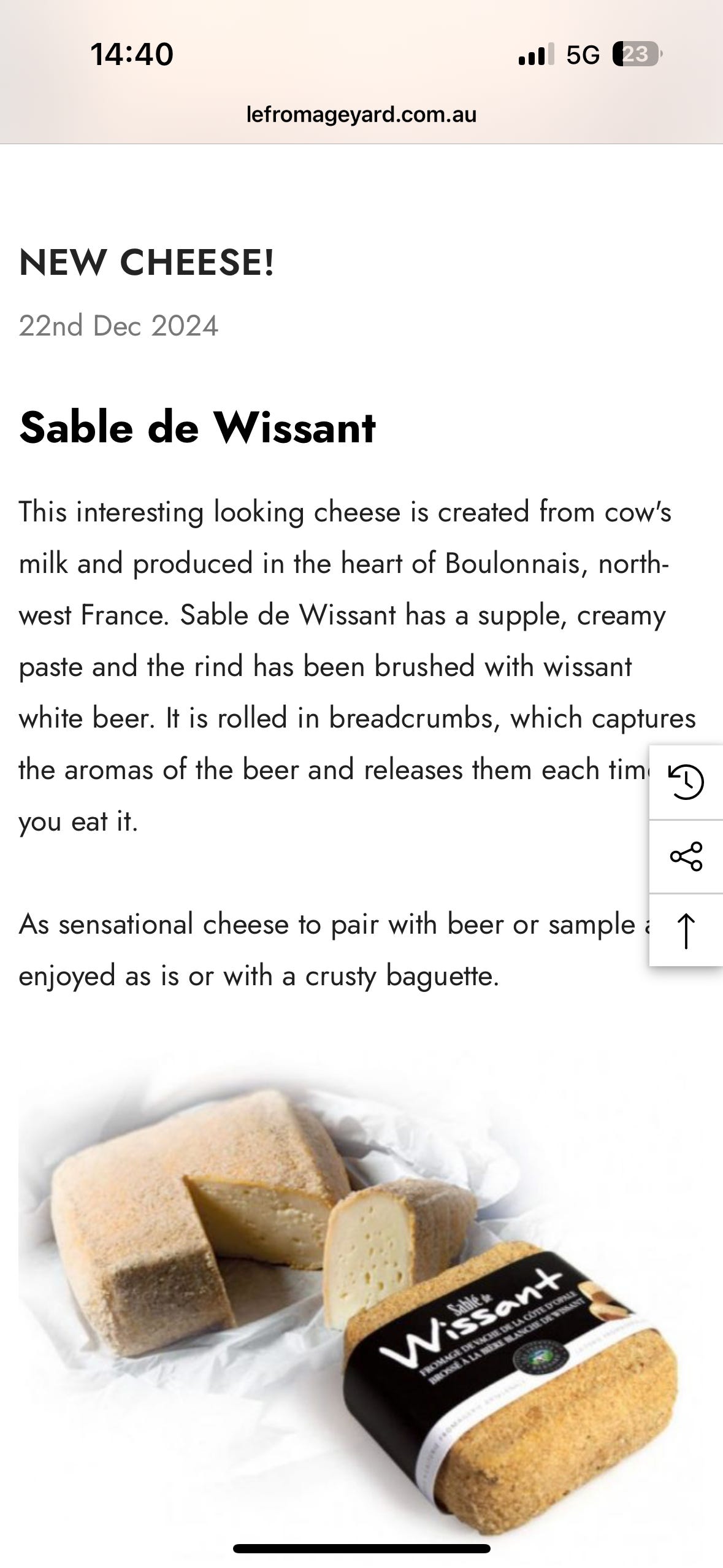 After the affinage (maturing) period, it is brushed with Blanche de Wissant, a white wheat beer from the local Brasserie des 2 Caps, run by Christophe Noyon, to enhance the flavours of its rind. The cheese is then coated in breadcrumbs to look like grains of sand on the beach at Wissant. The fine breadcrumbs give the cheese a distinctive texture and a pleasant crunch. The taste is delicate and aromatic. On the nose, the beer used for brushing adds a pleasant aroma.