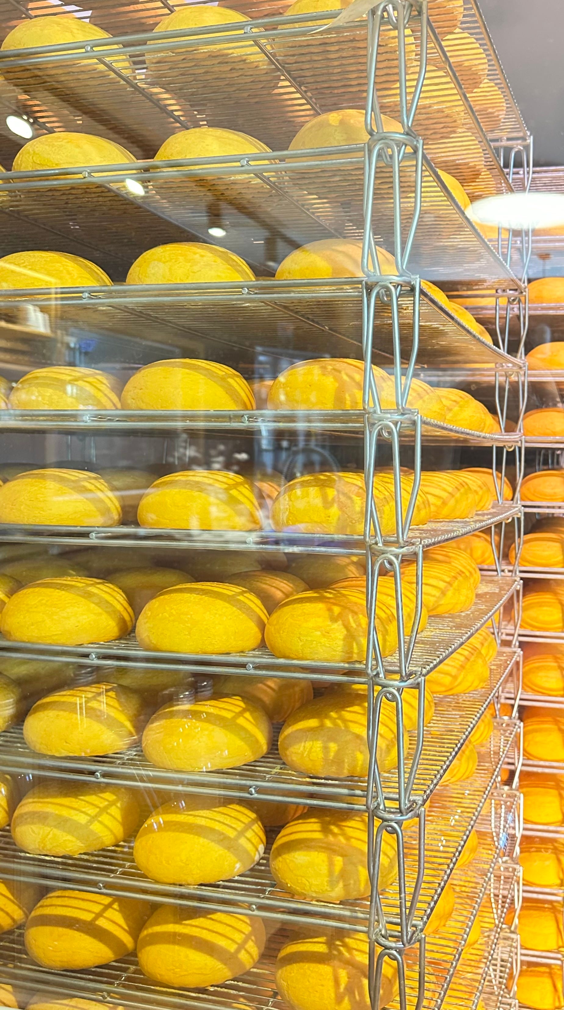 These 3 to 4 kg balls are turned every week to maintain a round shape and a smooth texture. It takes 30 litres of milk to make one Mimolette ball.