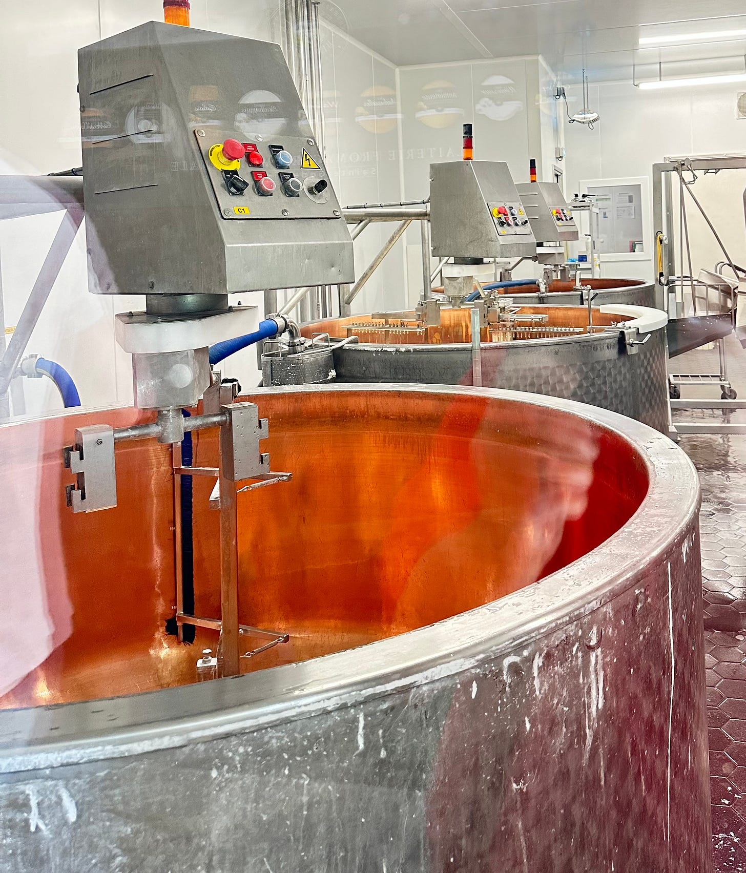 Once poured into copper cauldrons, the milk is inoculated with the lactic ferments.
