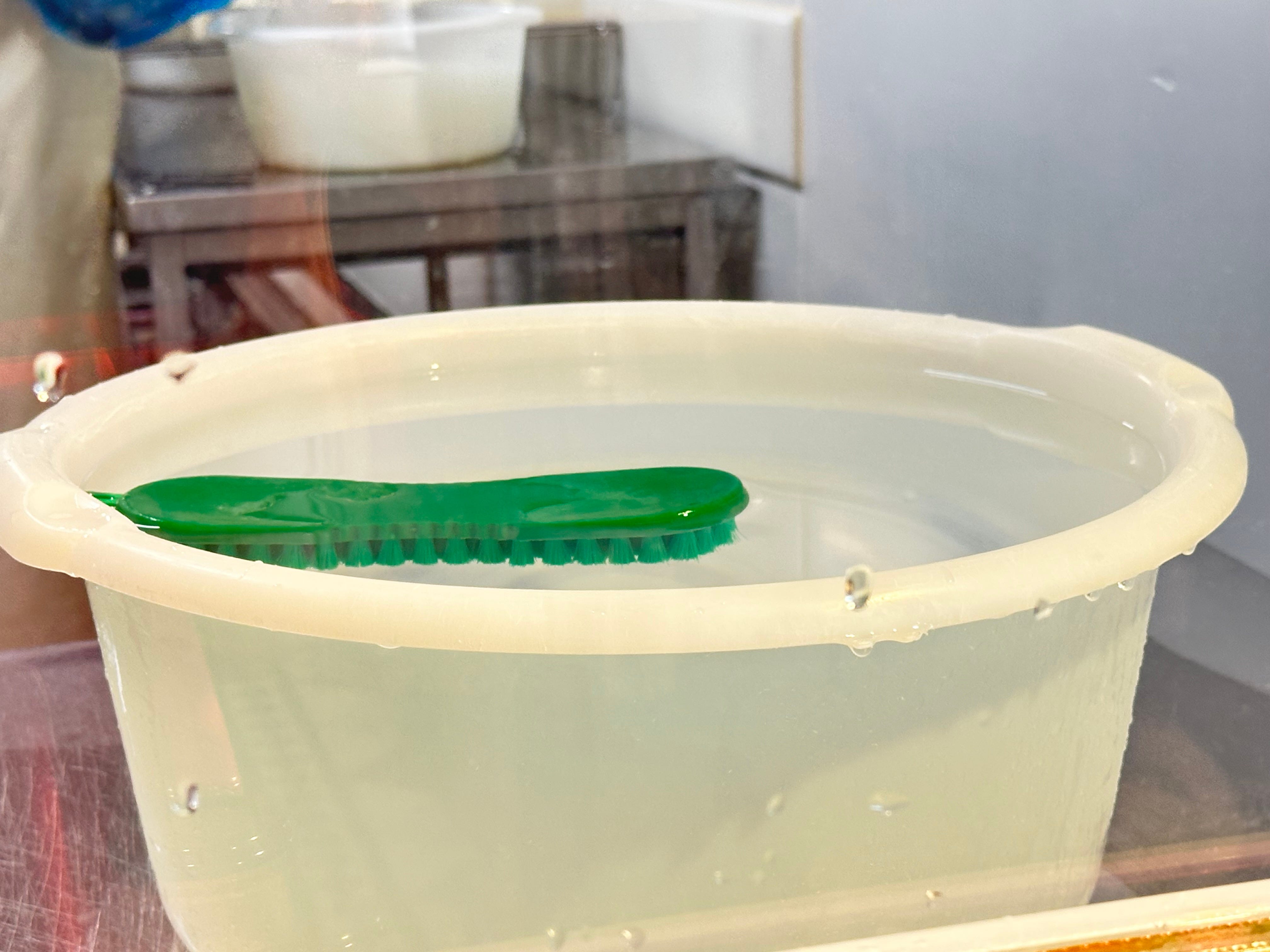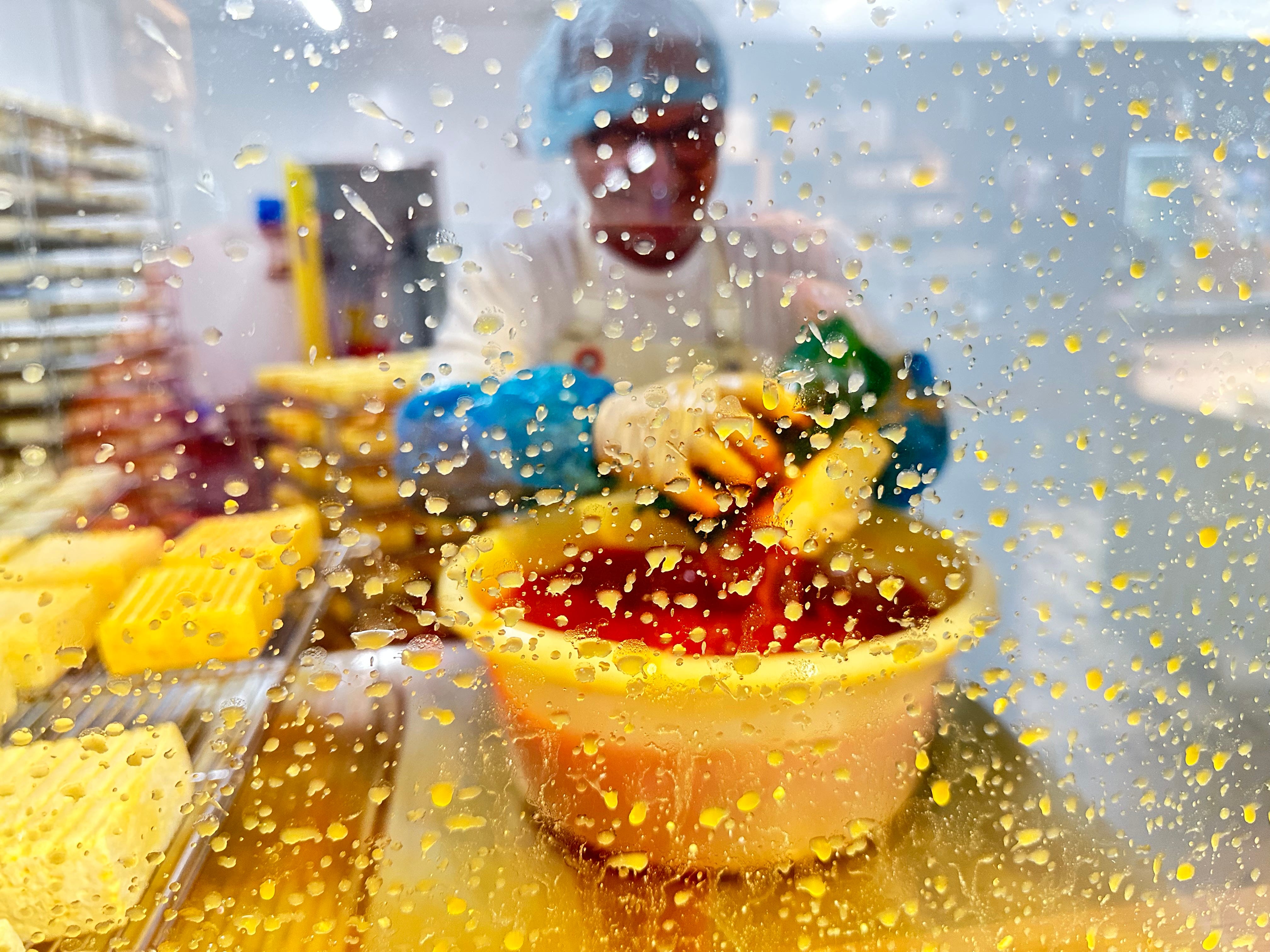 At Fromagerie les Frères Bernard, to cultivate a firmer and harder texture, the Mimolette curd requires a four-part process of stirring, draining the liquid whey out of the container base.