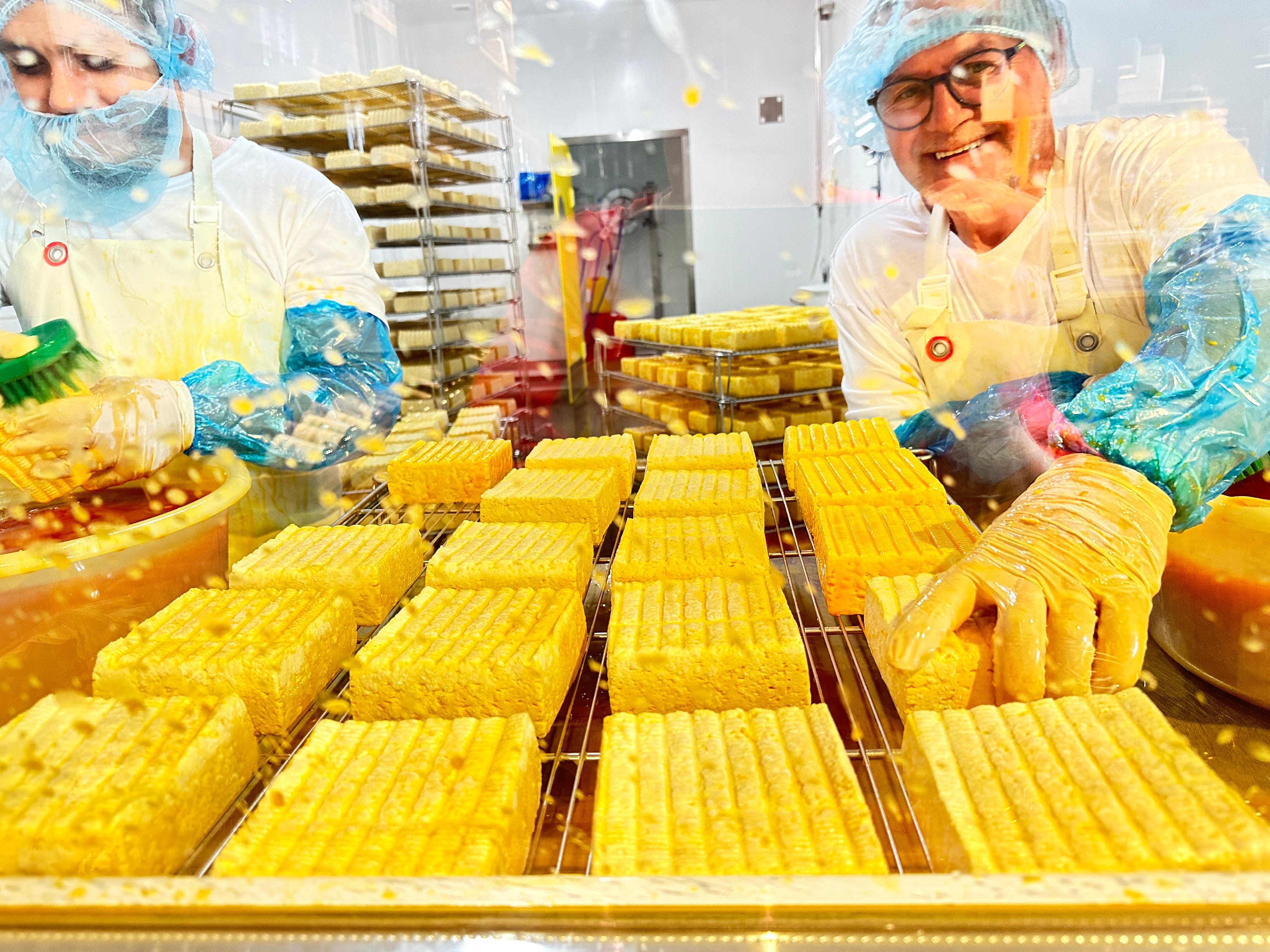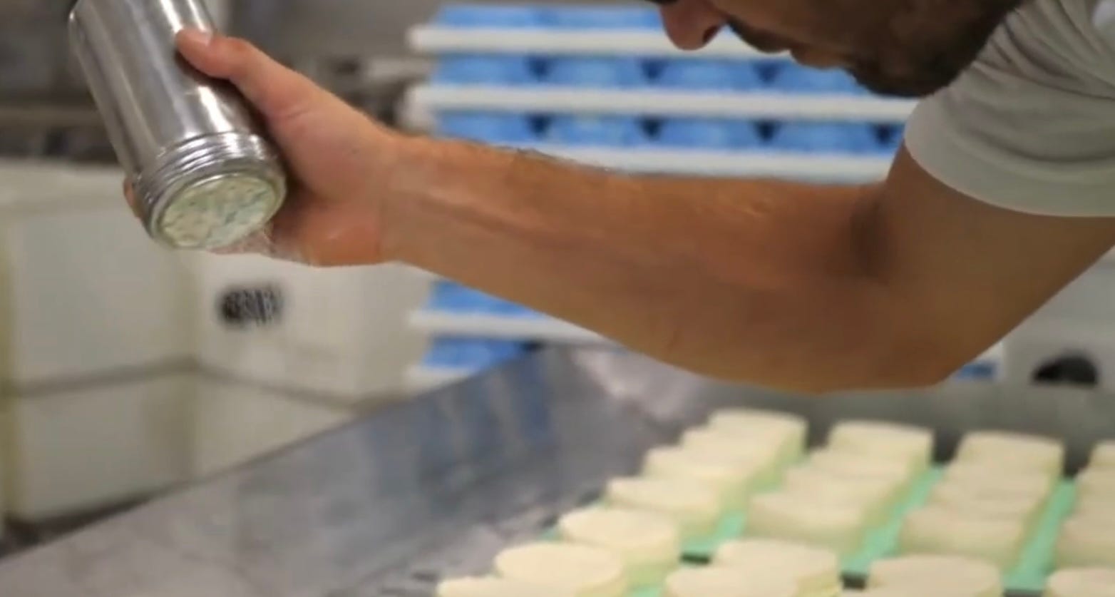 When the moulded cheeses are then plunged into a brine, a mixture of salt and water, this helps form the cheese's crust, giving the cheese flavour and preserving it.