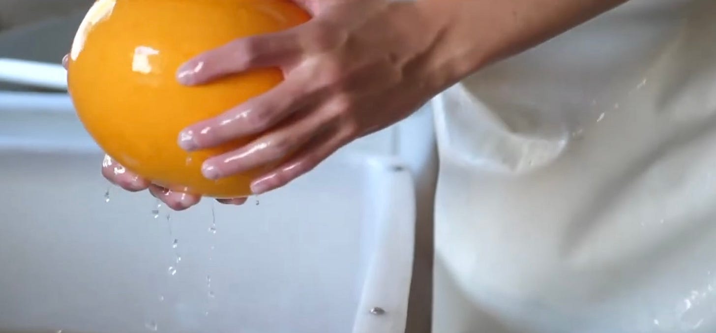 Finally, for Mimolette, the curds are placed into semi-spherical moulds for three hours. The mimolette is then refrigerated and immersed in a basin of salt water for 48 hours.