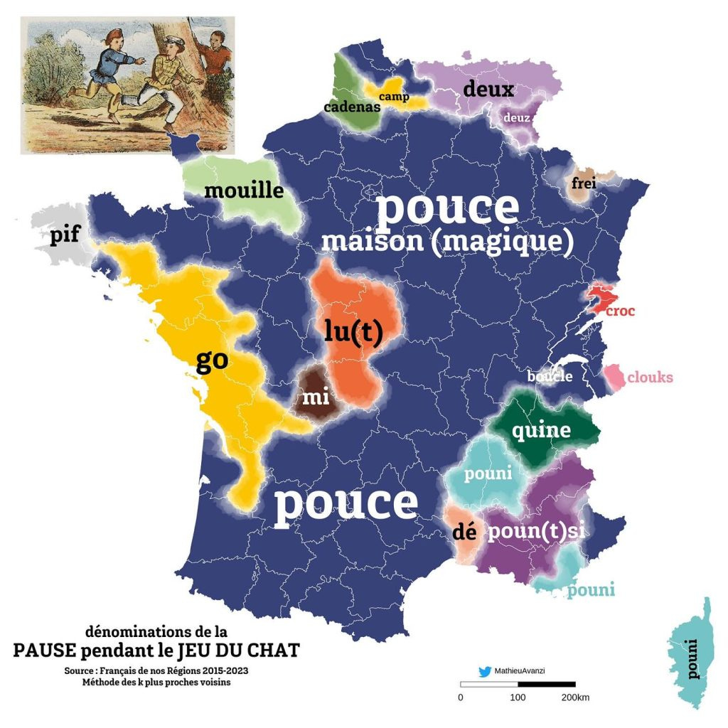 When kids are running around playing tag (jeu du chat or jeu du loup), sometimes they call a time-out to catch their breath. What do they say when they need a break? Usually it’s pouce (thumb) or maison magique, but it can be a lot of other things. There are words similar to pouce, like pouni, pounsi, and pountsi, but also others like mouille, go, and quine. In Belgiu,m it’s deux or deuz (for “two minutes”?), and near Geneva, it’s boucle (or “loop”) because you make a circle with thumb and forefinger to call for a pause.