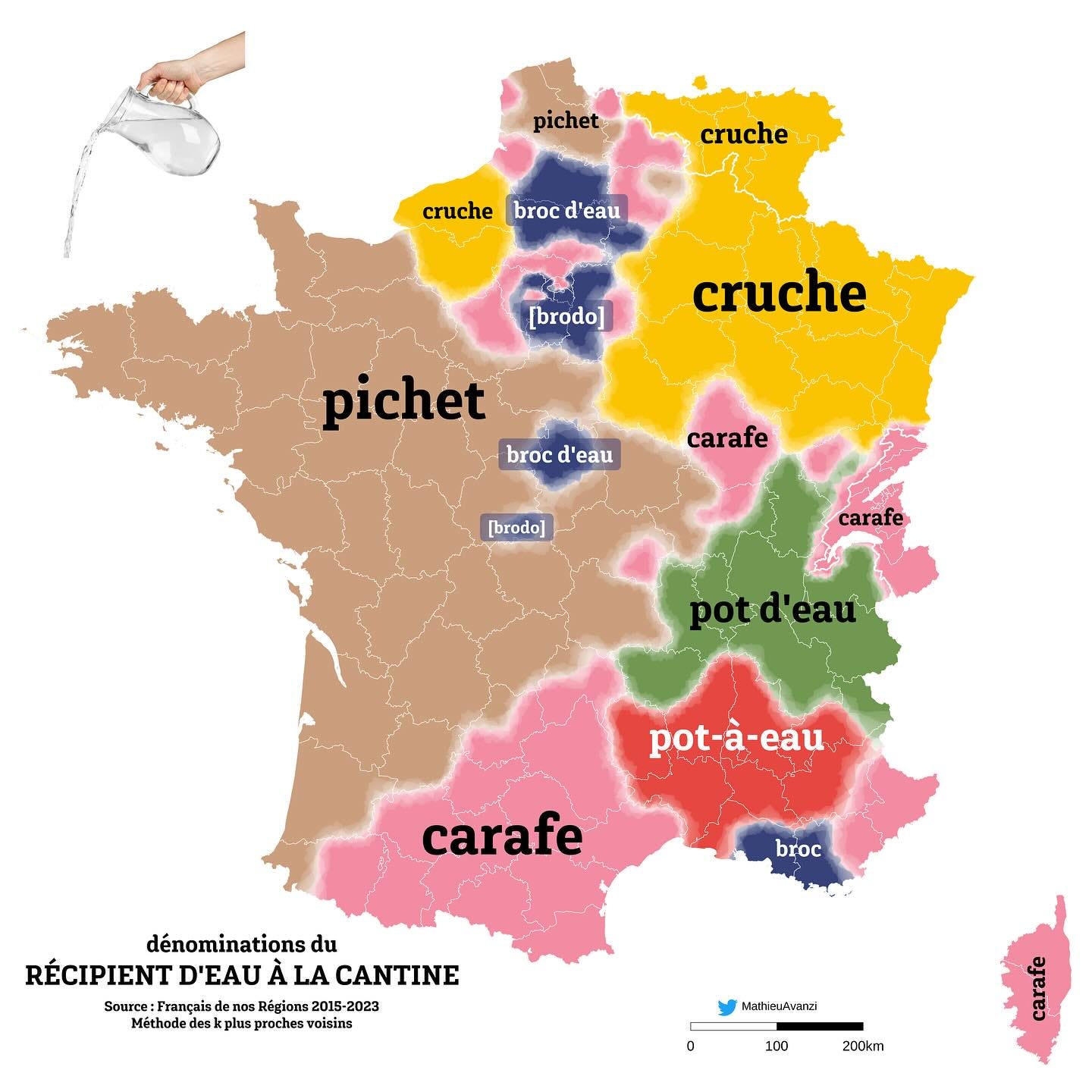 To ask your server for water at a restaurant, what you say depends on where you are. In much of France, you’ll ask for a pichet. Around Lyon, it will be a pot d’eau. Further south, it’s a pot-à-eau, and finally in Marseille, a broc. And let’s not forget cruche, carafe, and brodo!