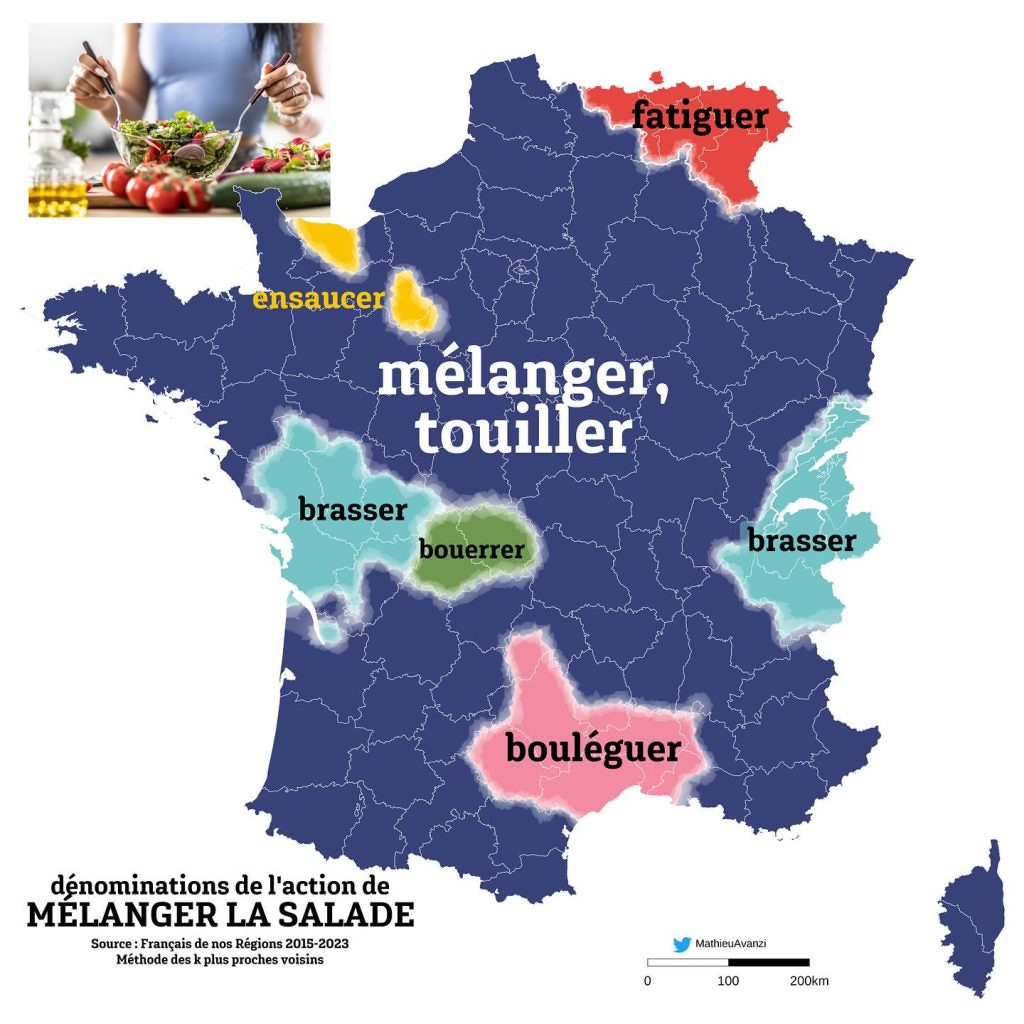 When they mix dressing into their salad, most French say it is to mélanger or touiller the dressing with the salad. For others, it is brasser, in the Languedoc we have bouléguer, from the old Occitan language, and the Normans like to ensaucer. Finally, the Belgians use fatiguer, which sounds like they are beating up that poor salad.