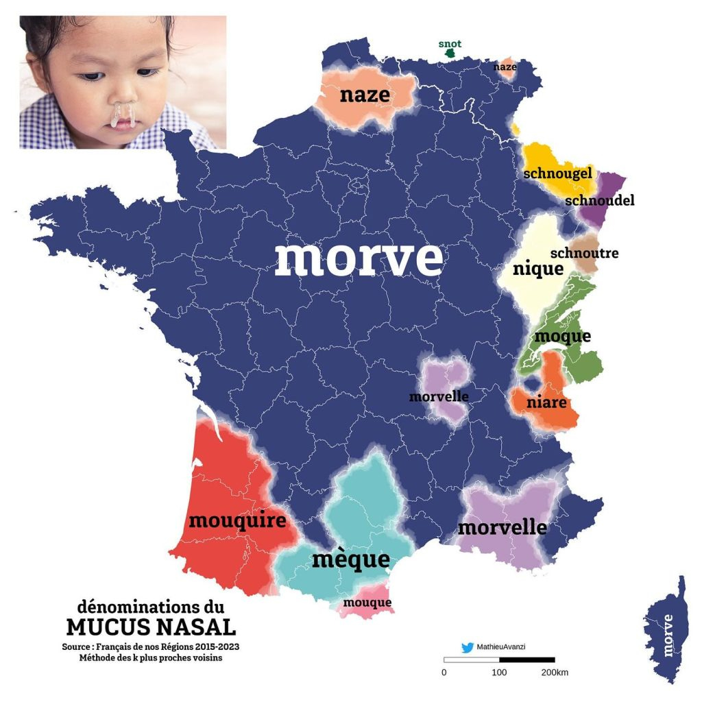 The French have many words for what comes out of your nose (ok, I’ll say it: snot.) Most of France says morve, which has a neutral sound. I prefer words from the south, like mèque, mouque, and mouquire, which sound more like what it is we’re talking about. But it’s the regions closest to Germany that win, because how can you beat schnougel, schnoudel, and my favorite, schnoutre?