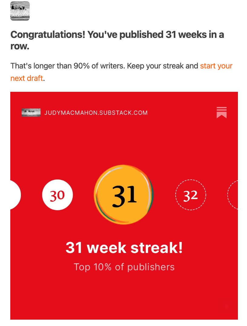 It’s only for the last 31 weeks that I’ve been here on Substack. In fact, for every newsletter I send out, Substack sends me a little congratulatory plaque. It seems that only 10% of us write to subscribers every week. That surprises me.