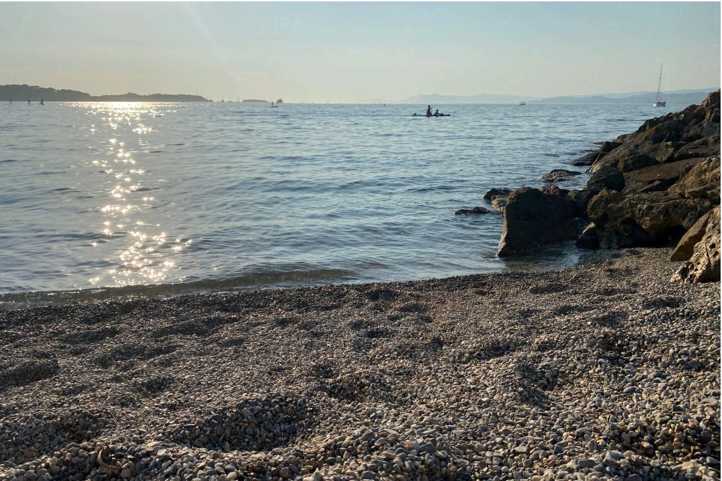 The beach in Le Brusc is really beautiful. It is rocky, so bring your water shoes. Thanks to the rockiness, the water is the bluest ever. You can see right down to the bottom and it’s just lovely. I also love the views from here. When you’re on the beach, you are looking over the cliffs of Sanary-sur-Mer and Bandol to the right and the island of Les Embiers to your left. Off in the distance, you can also see the rolling hills of the “arriere pays” (the countryside) which is covered in vineyards. I think it is one of the prettiest views that I’ve seen here. I also think that this is the best place to take in the sunset. As the sun goes down over the expansive bay, the cliffs become a silhouette. It is just breathtaking. Every time!