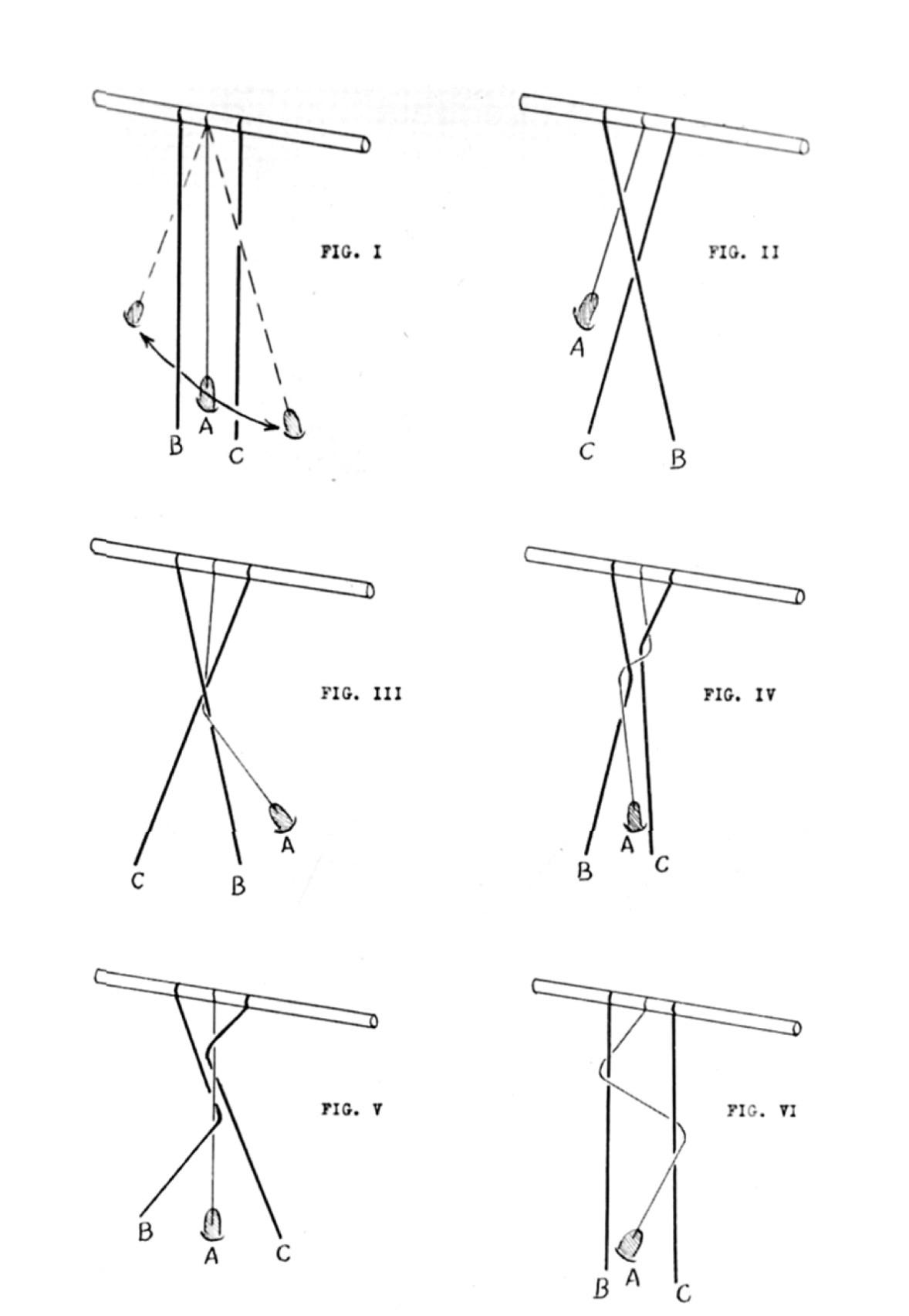 FIG. V If the bobbin thread attached to weight “A” is under tension and the warp threads are loose (I.e. not under tension), then the warp threads B and C will twist around the bobbin threads.