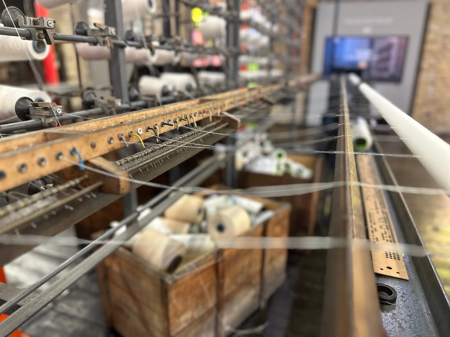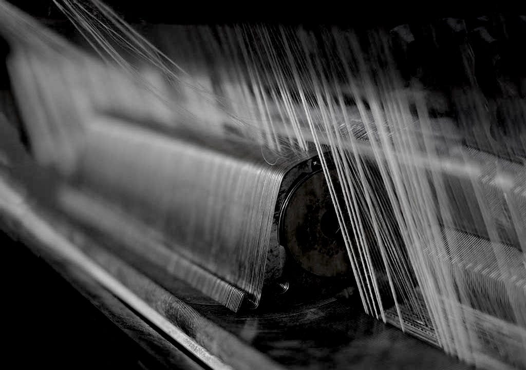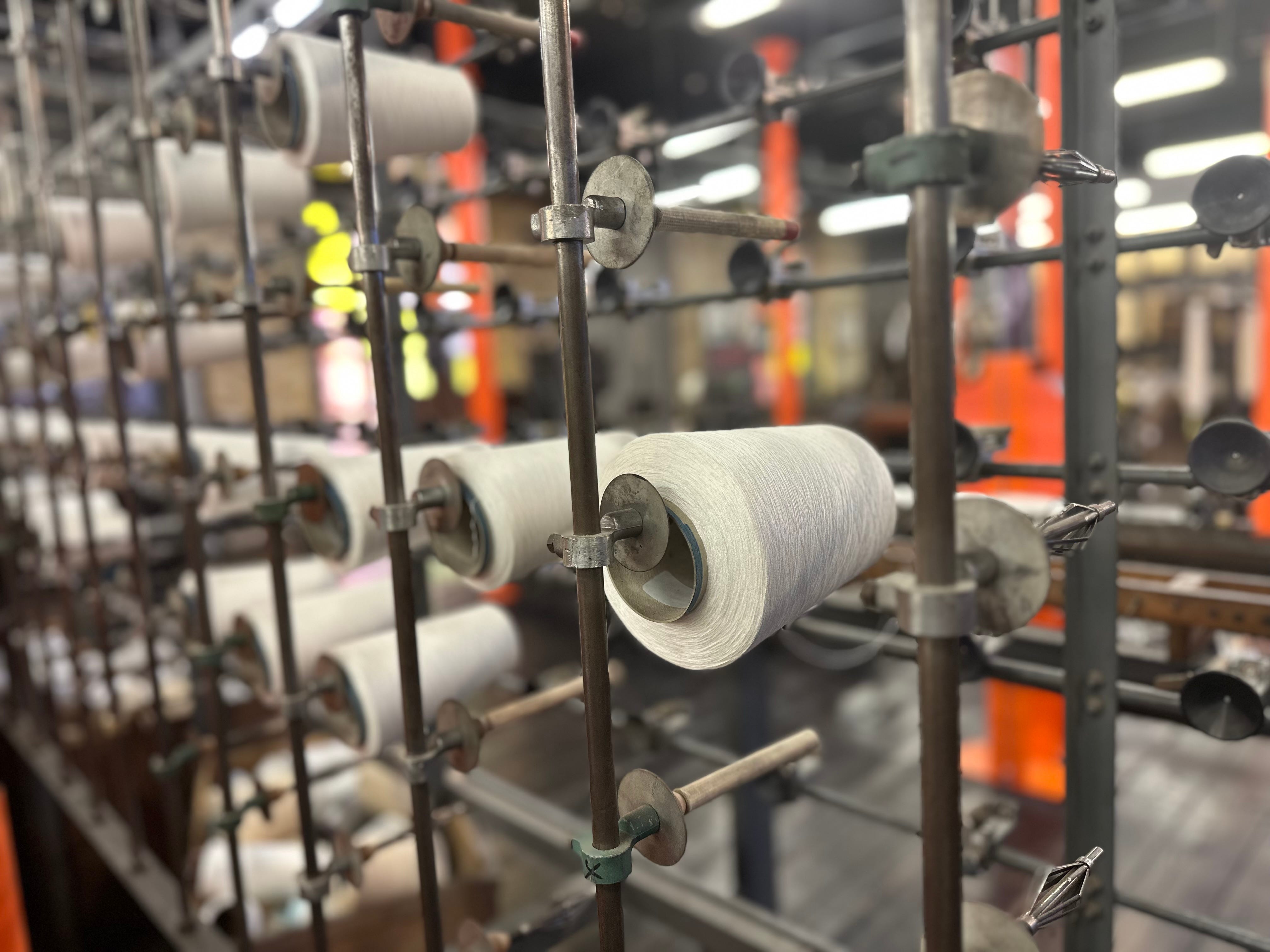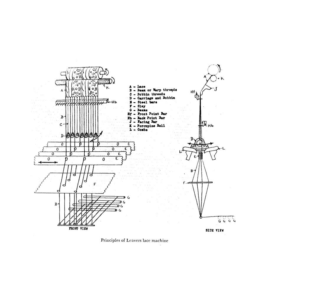 These threads become the vertical warp threads of the fabric, which are fed into the Leavers machine.