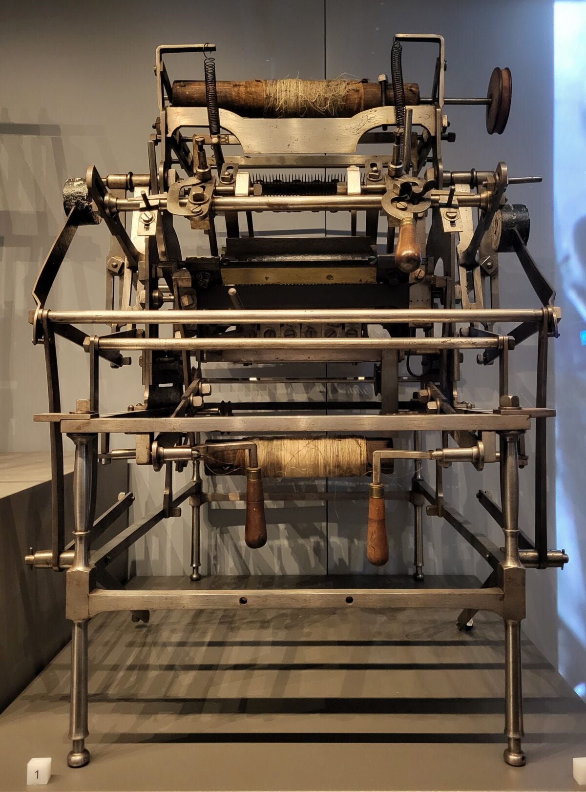Significantly, John Lever’s machine allowed for the later addition of Jacquard cards that directly patterned the lace, rather than creating a hexagonal net tulle which had to be subsequently embroidered by hand. Such a feat could never have been achieved on Heathcoat’s original Lace machine, as it relied on two tiers of bobbins.