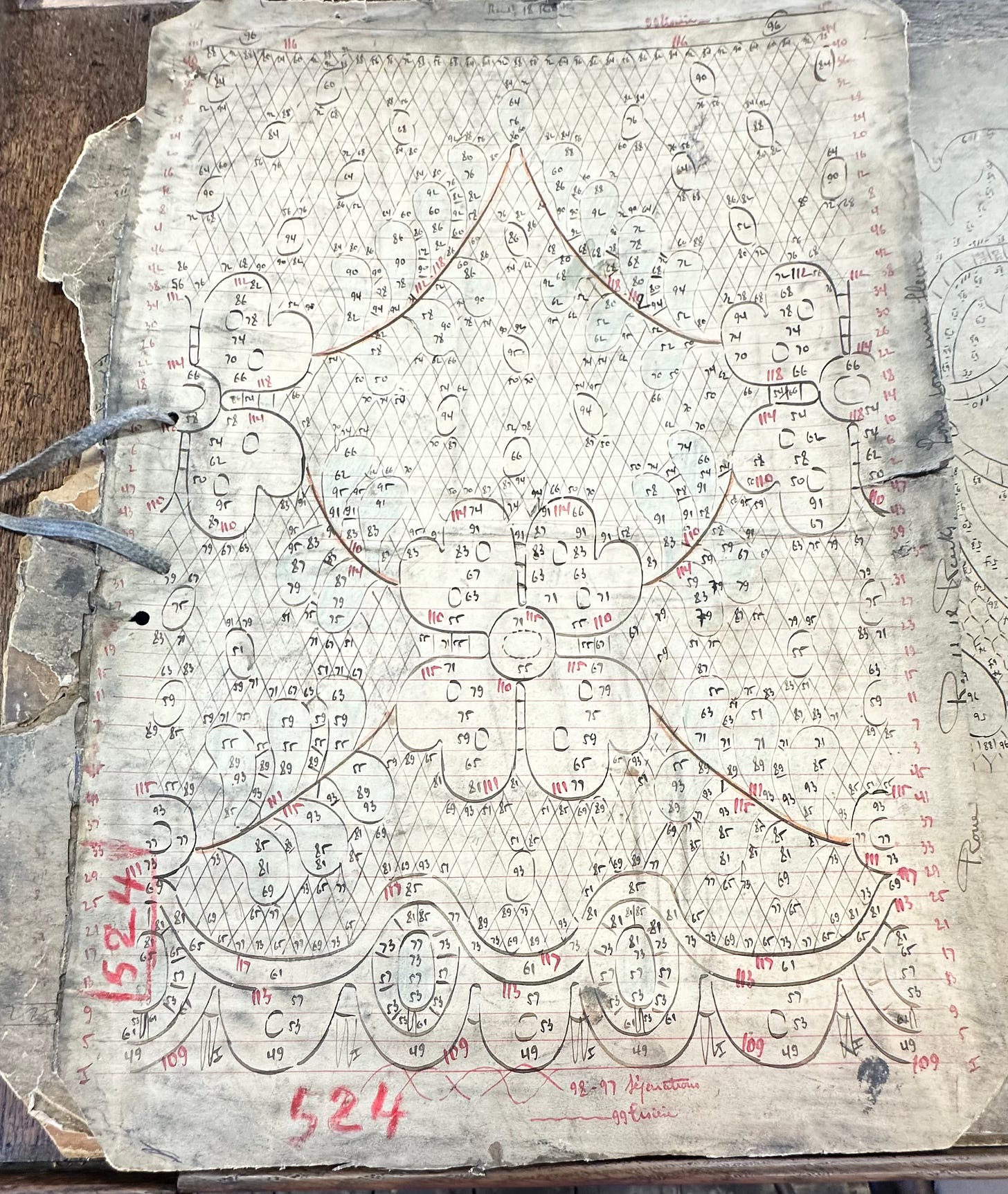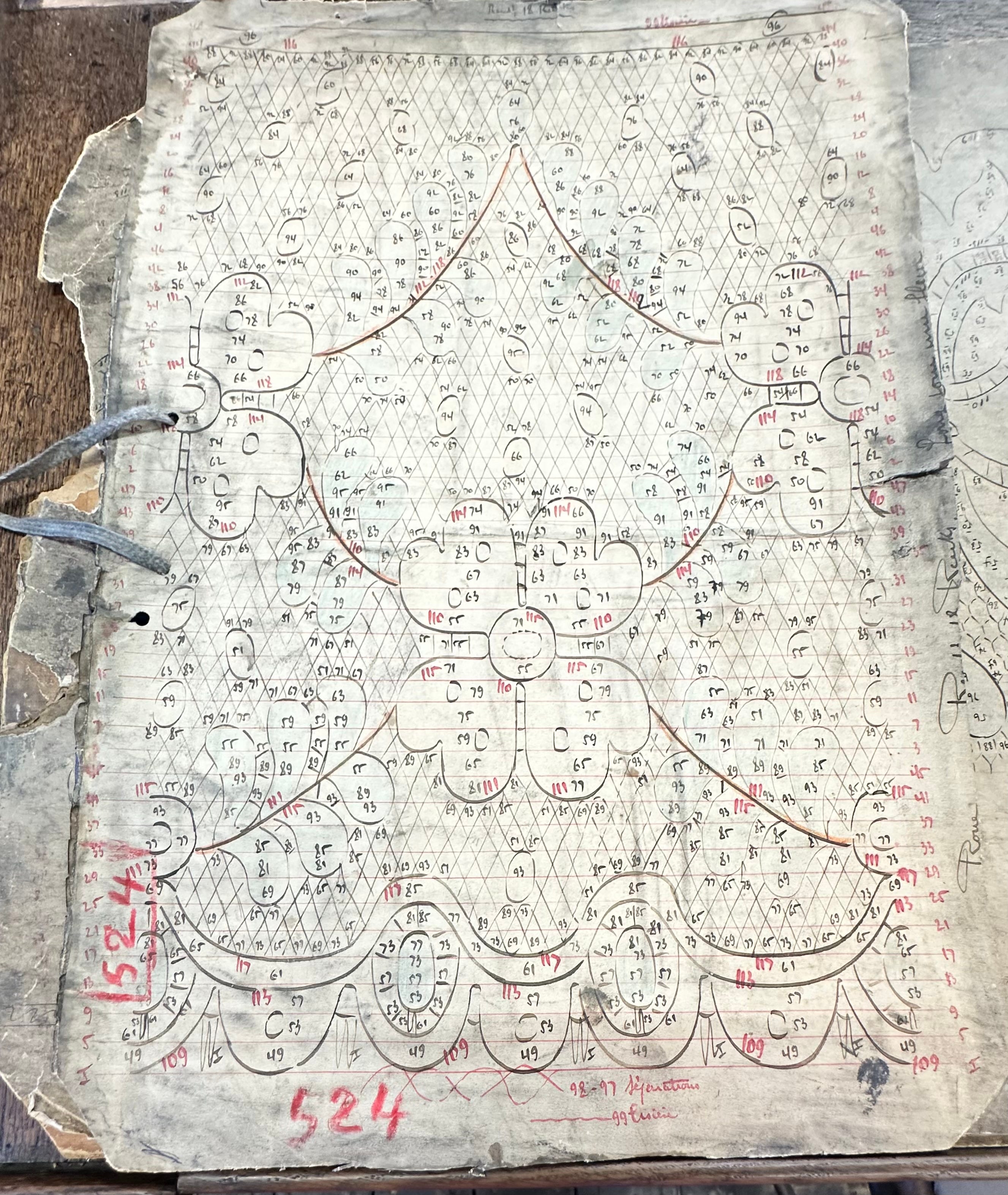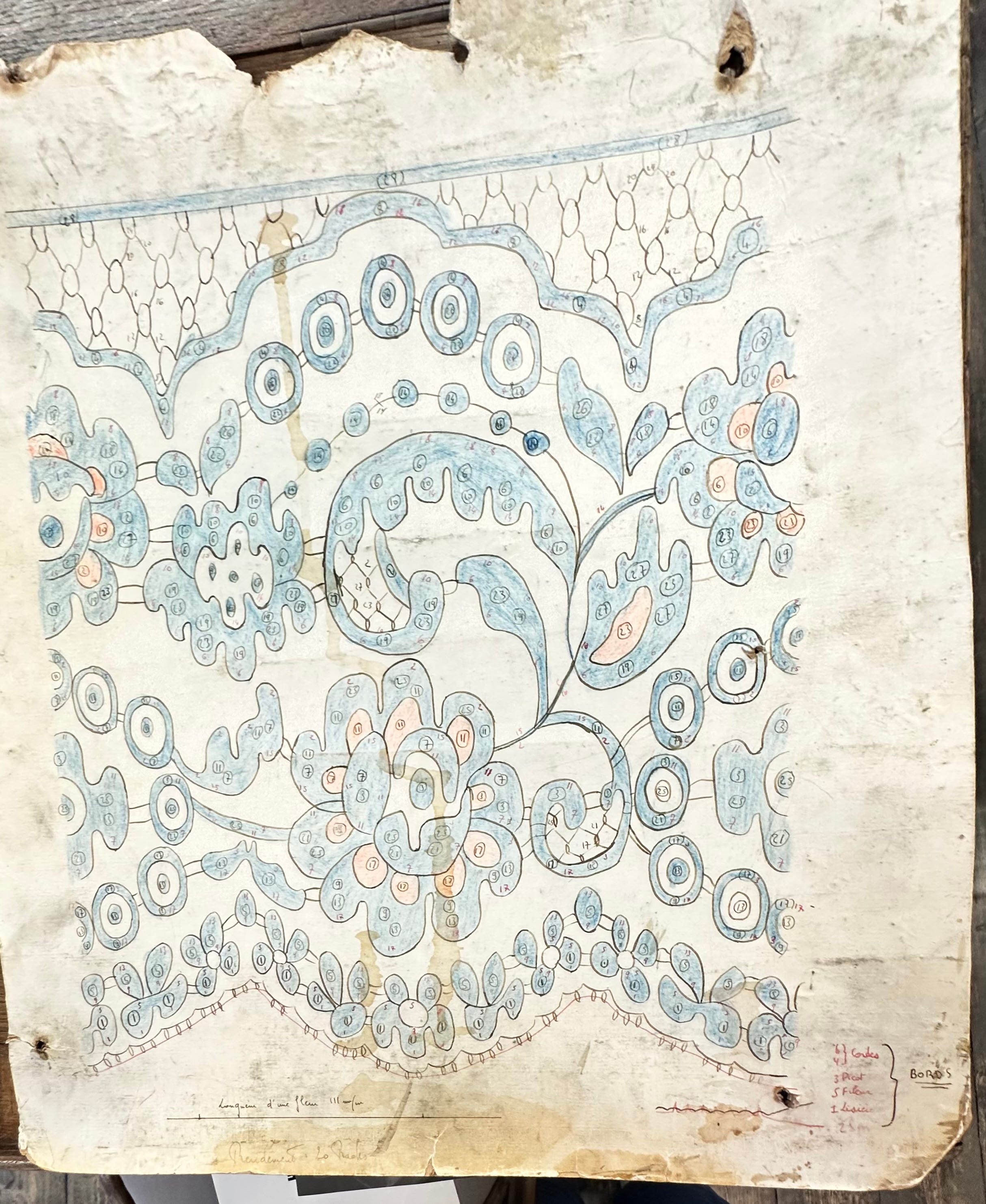 The esquisseur now numbers and colours the sketch to record the movements of every machine part and every yarn thread.