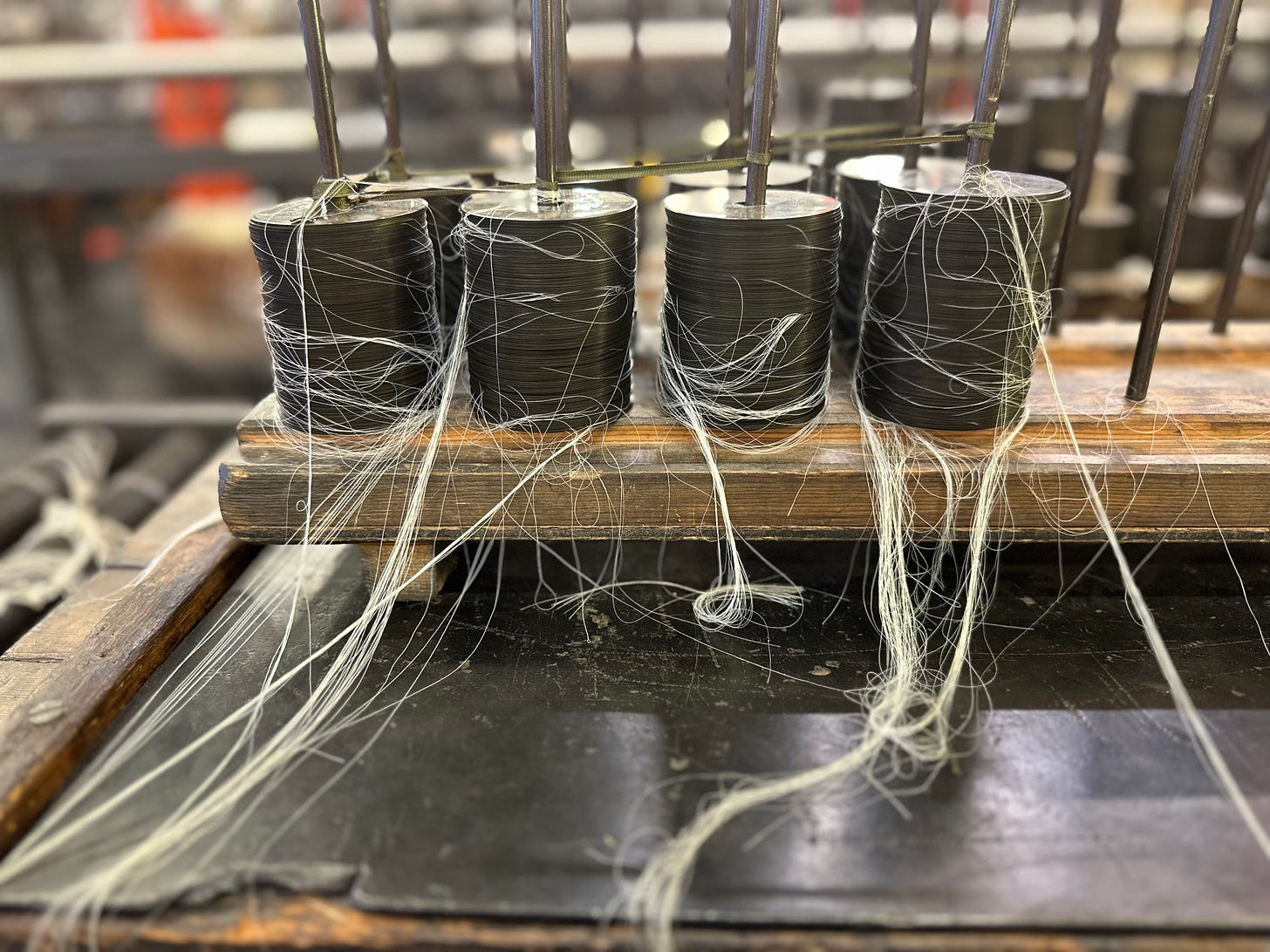 Each bobbin sits in a carriage. The wheeler opens the stack of bobbins with their nail and inserts the thread. The wheeler may have 100 threads to insert, producing a winding of 100 bobbins.