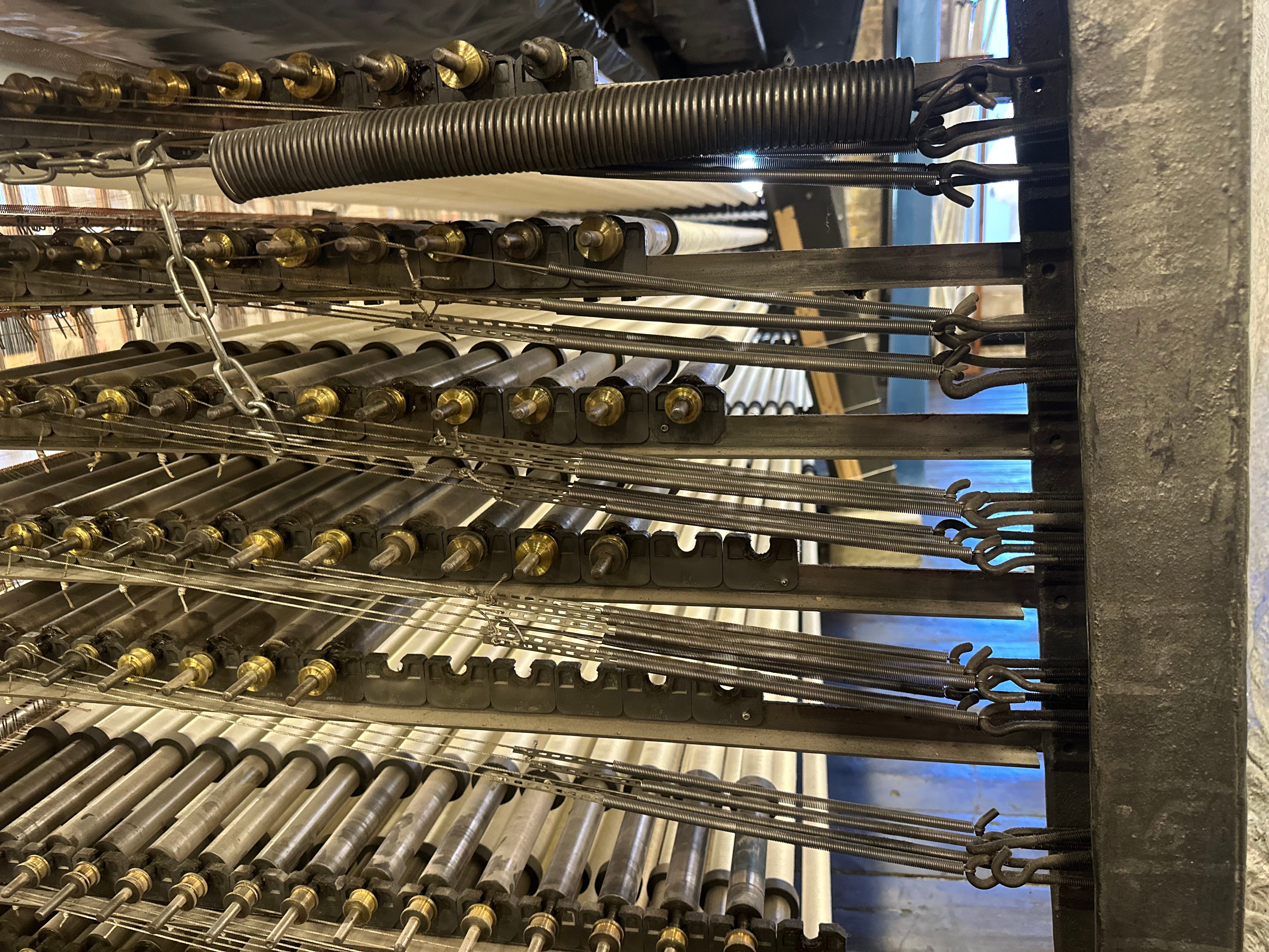 For one set of the machine, there are 47 windings of 100 bobbins. So that makes 4,700 for a single set. All the threads are aligned one after the other - you can’t have them overlapping. Precision is necessary here to avoid errors in the produced Leavers Lace.