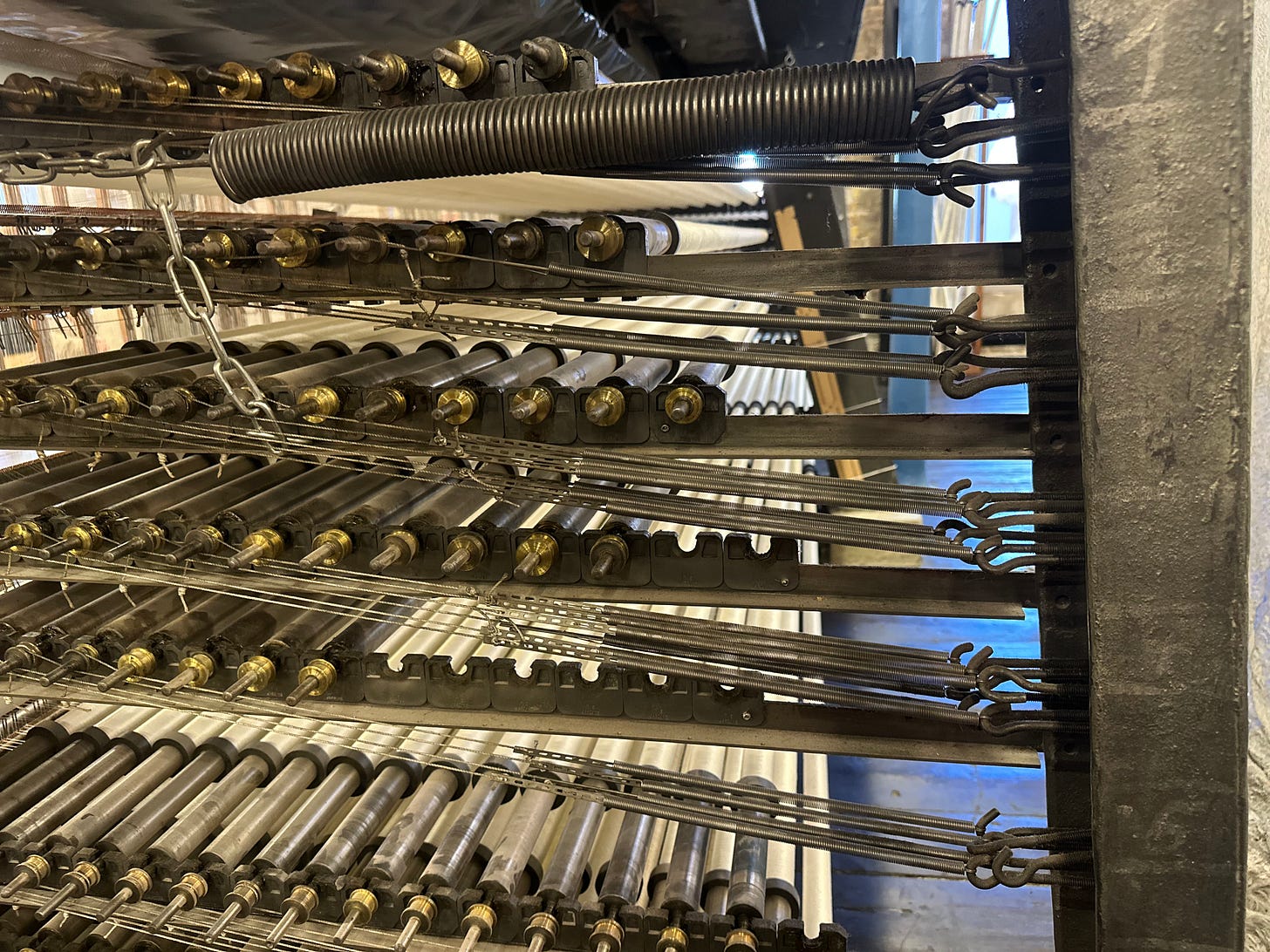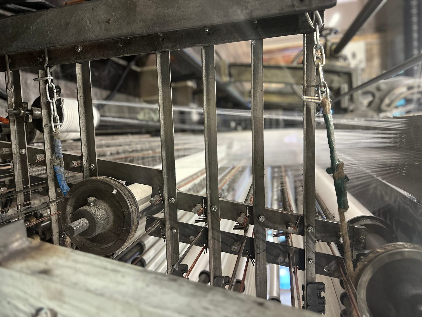 The Chainer positions the warp beams, consisting of wound threads under tension on long metal rollers, underneath the Leavers Machine frame.