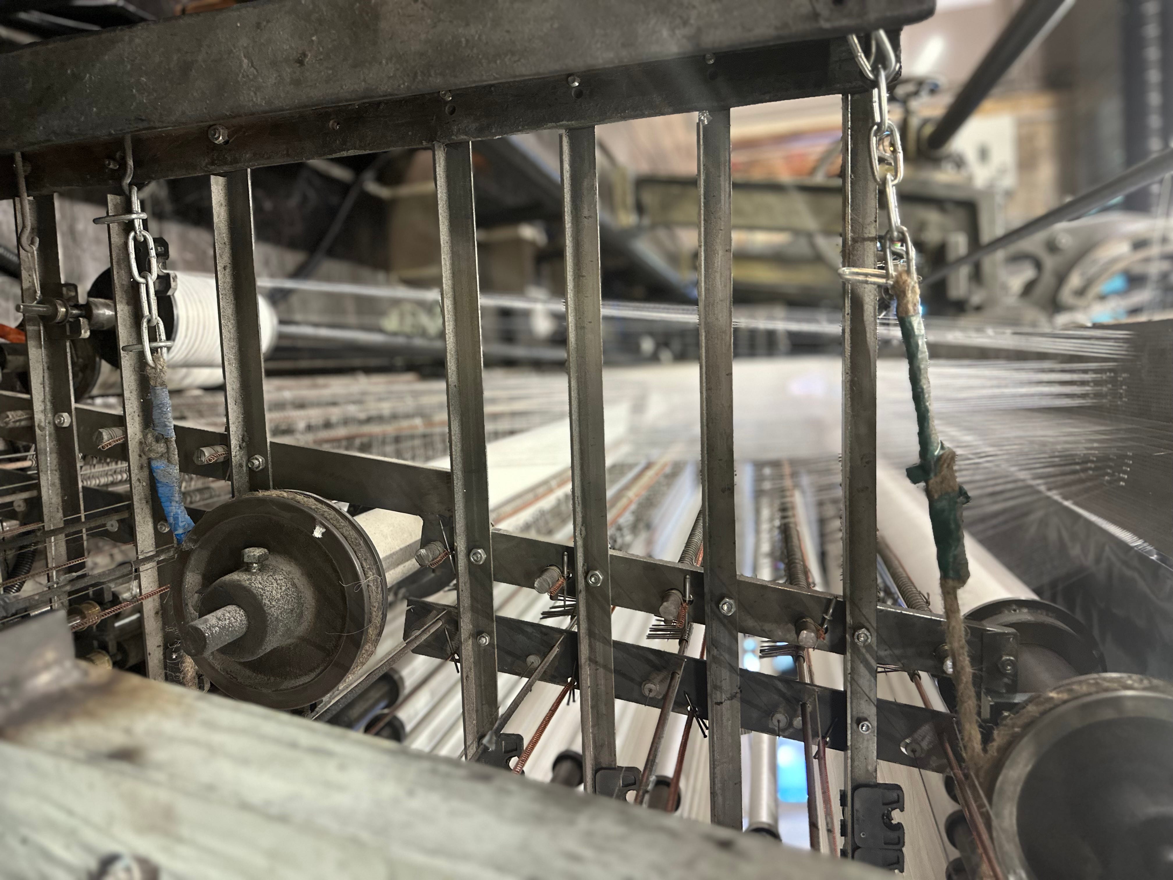 The threads go through the tension unit. Then bars are added to even out the tension. This is necessary to avoid defects and maintain quality.