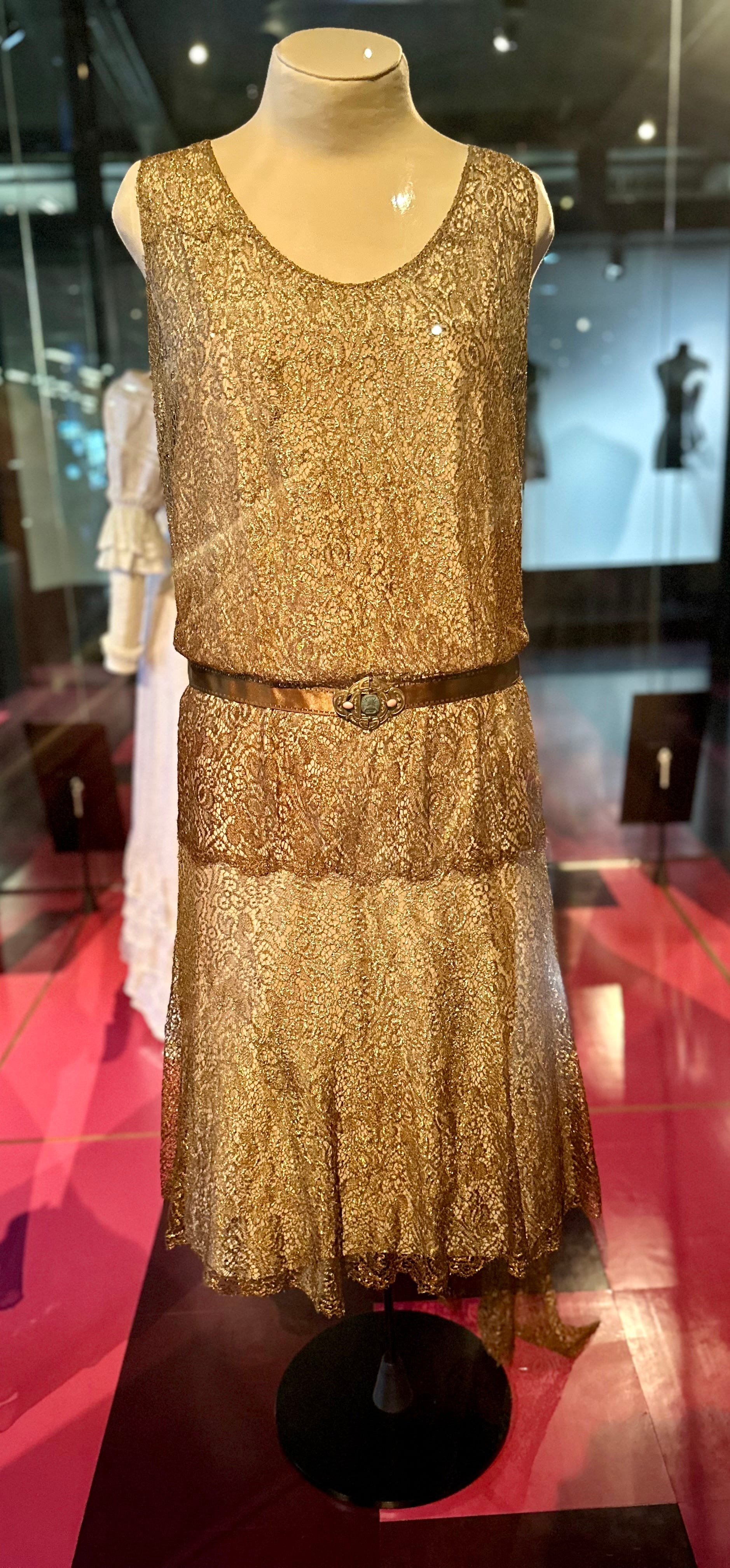 Photo: author, Evening dress, around 1925, Leavers lace made of coppery gold lamé threads, Silk satin belt, metal buckle featuring a stylised scarab beetle and costume stones.
