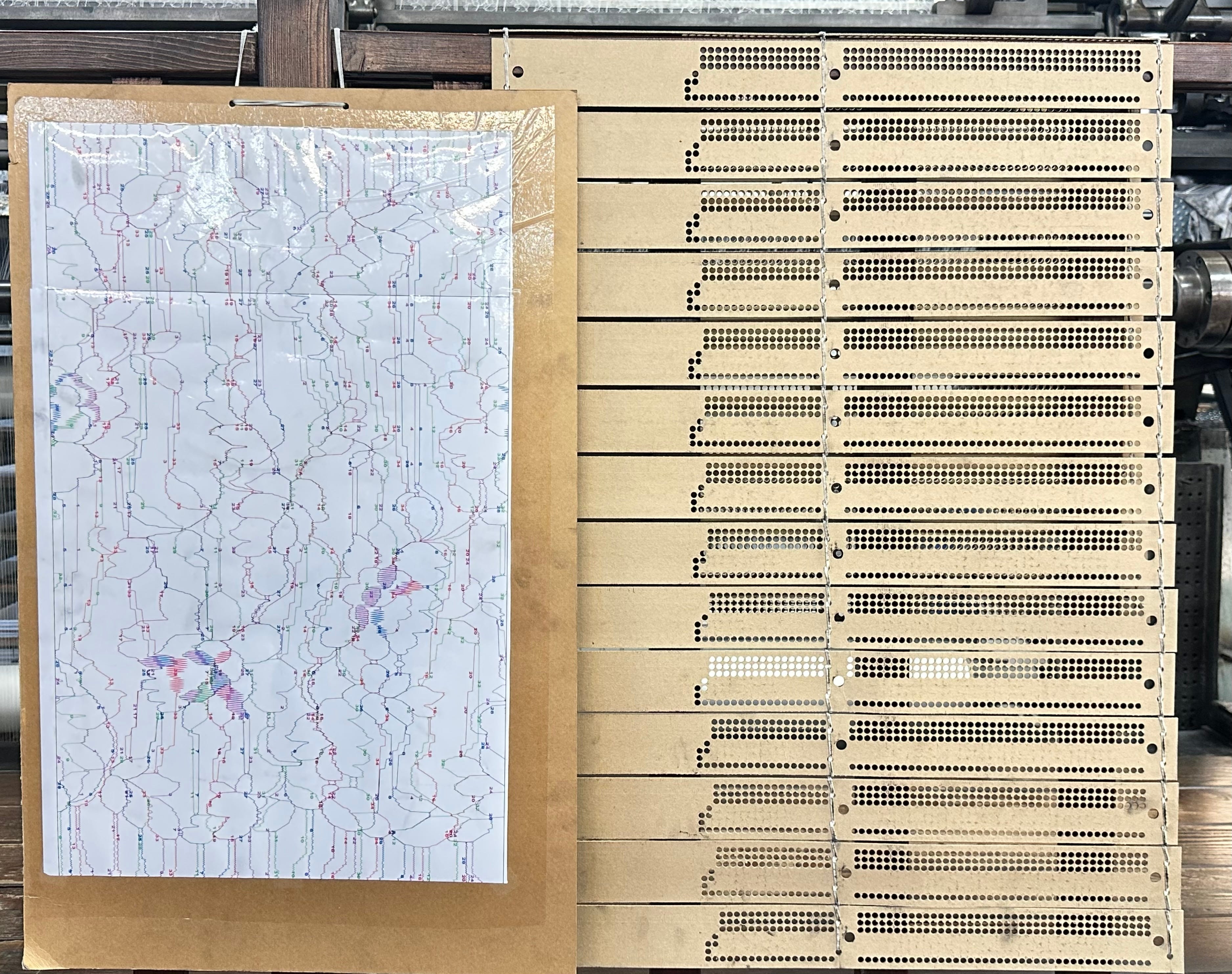 The hole pattern dictates the movement of the Jacquard droppers and blades, which thereby control the movement of every bobbin as they twist around the warp threads.