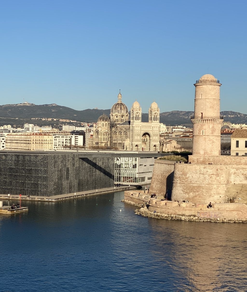 To the left, you will see the Mucem, and just behind it Le Cosquer museums and Les Terrace des Ports.