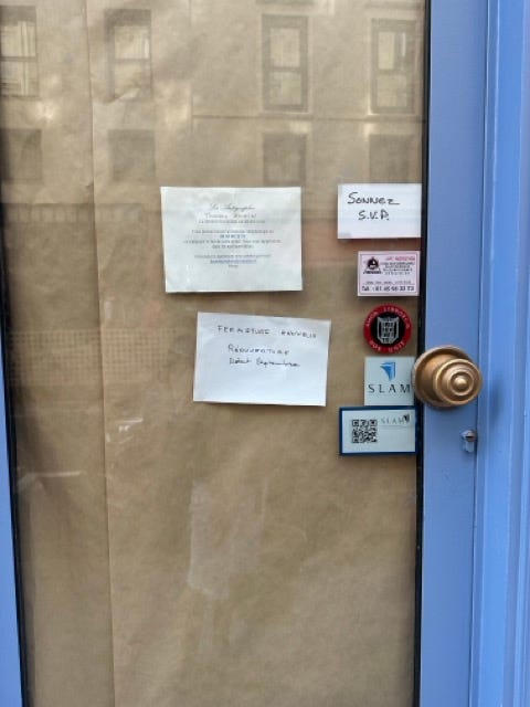 The butcher tapes a handwritten note to the door: Fermé jusqu’au 2 septembre. The florist is dark. A boutique is papered over in brown kraft, with a promise to reopen after themer.