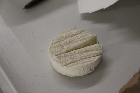 Flipping the rack ensures that the cheeses age evenly, to take on their characteristic texture: a fudgy heart surrounded by a runny creamline, all encased in a thin, velvety rind that bears the marks of the grill upon which it’s aged: a hallmark of the cheese. Typically, Delpeuch notes, these marks are only visible on one side.
