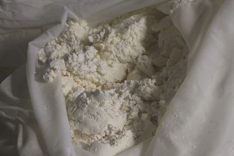 First, the fresh milk is transferred into two large tanks to which a small amount of rennet is added, along with ferments produced here on the farm. The AOP imposes at least an 18-hour curdling, but the team pushes this to a full 24 hours to develop even more flavor. Next, the curd is drained in large bags for a further 24 hours.