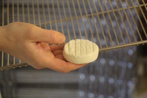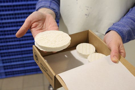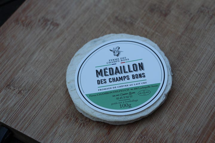 Nevertheless, in January, the aging cellars are relatively empty, following the surge of sales at Christmas, when Delpeuch proposes some specialty products for holiday tables, like apéro-sized buttons of chèvre or barely-set fresh curds coated in black pepper or basil. These join a wider range of offerings she proposes all year long alongside Rocamadour. The Médaillon des Champs Bons is a larger-format cheese more than four times the size of its AOP cousin, though aside from its size, Delpeuch explains, the Médaillon is very similar to the teeny