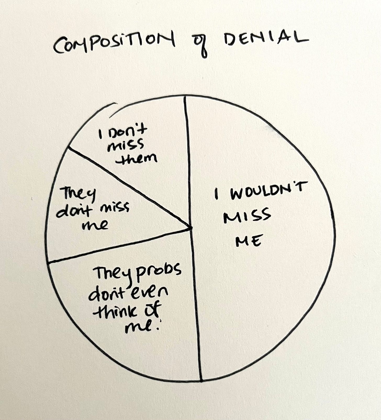 I’m not sure that everyone necessarily goes through the denial stage, or if they do, if it is rooted in the same logic. The logic behind my denial is that I assume no one misses me. If you have a higher sense of self worth than I do, maybe you get to skip denial, but that means you will also miss out on all of the river in Egypt jokes.