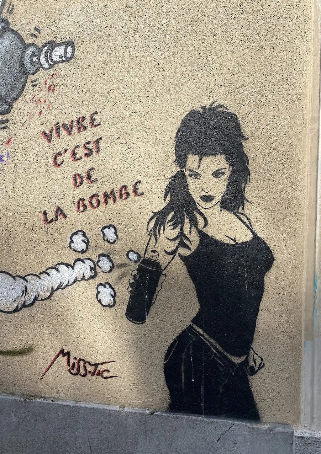 After two years in the U.S., she returned to France. From 1985, her stencils popped up in the Montmartre neighborhood where she grew up. Her work later spread to the Ménilmontant, le Marais, Montorgueil, and la Butte-aux-Cailles areas.