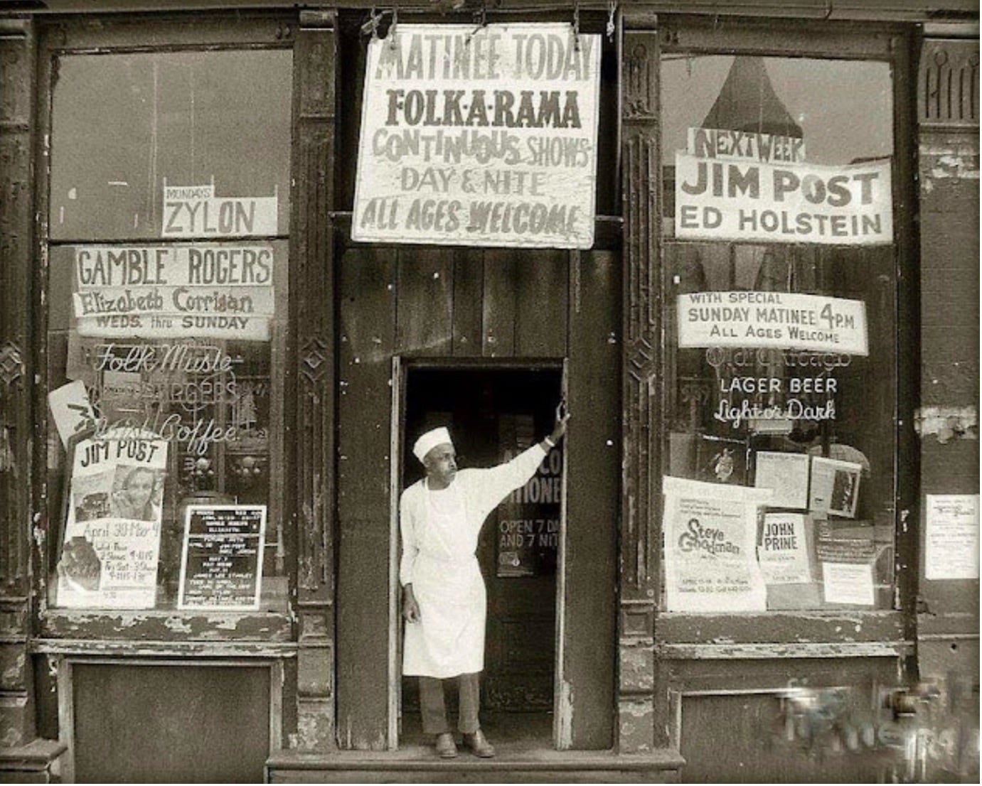 Chicago’s Old Town vibe in the 1960s – 1970s, with posters for Prine, Steve Goodman, and Jim Post in the front windows at the Earl of Old Town bar and club.