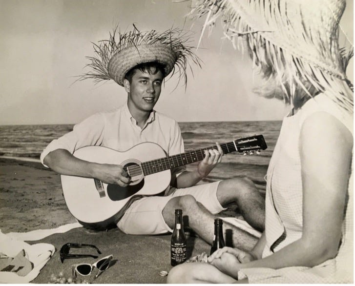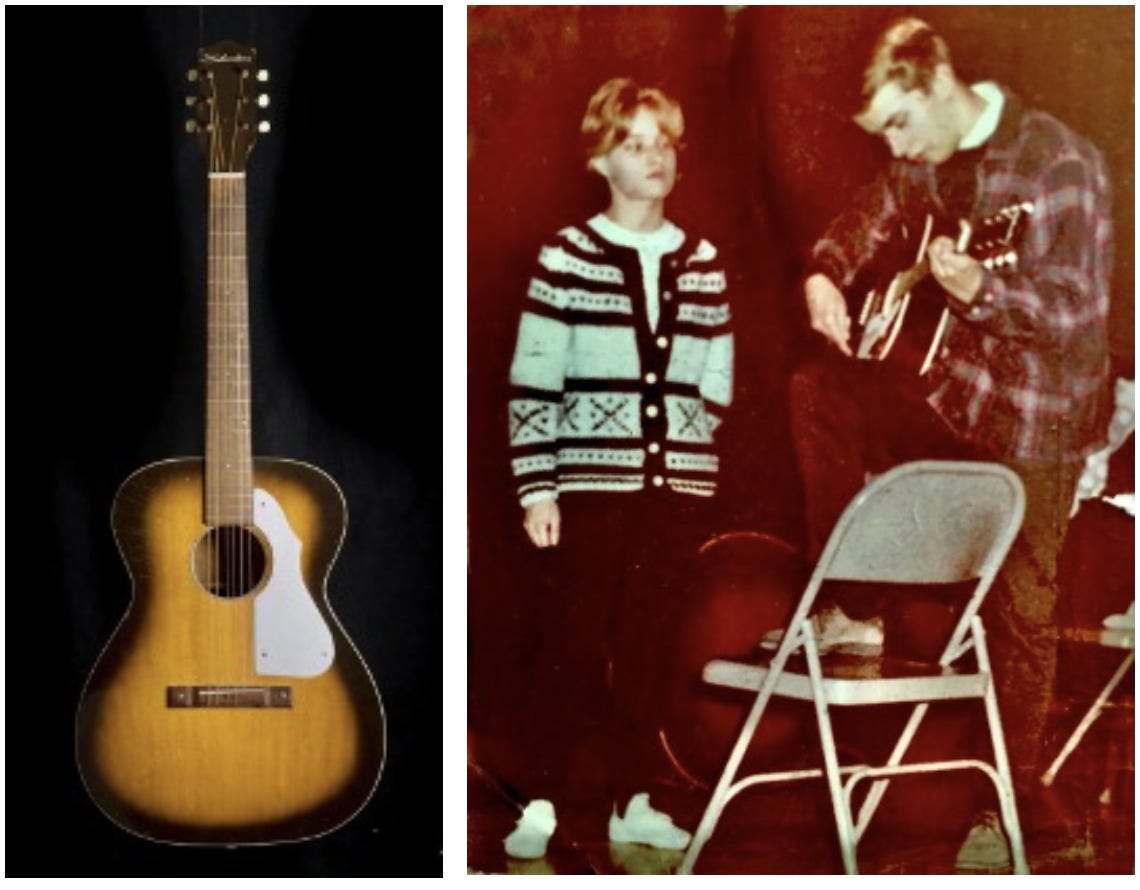 LEFT: My first guitar: a Silvertone made by Kay or Harmony in Chicago. It sold for $19.99 through the Sears and Roebuck mail-order catalogue, a precursor to online shopping at Amazon. RIGHT: Fuzzy photo from 1962 playing my first guitar and singing “Michael Row the Boat Ashore” with Jackie Grey in Wilmette. I had to look closely at my fingering back then.