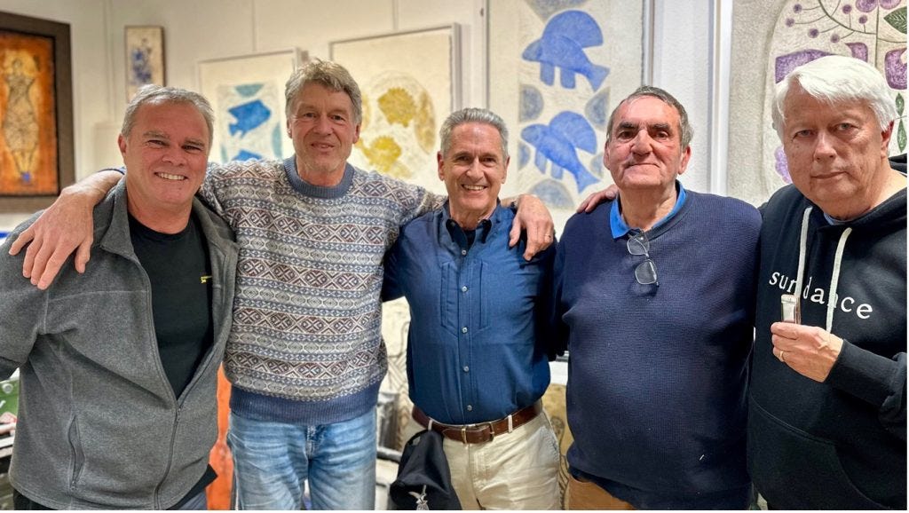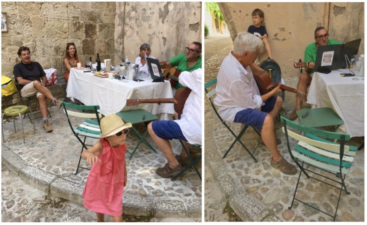Practice session with Bernard while enjoying a light lunch with local artists Stella Erbibo, center right, and Serge Dos with Elise Dartmour, center left, in front of their galleries in Seillans..