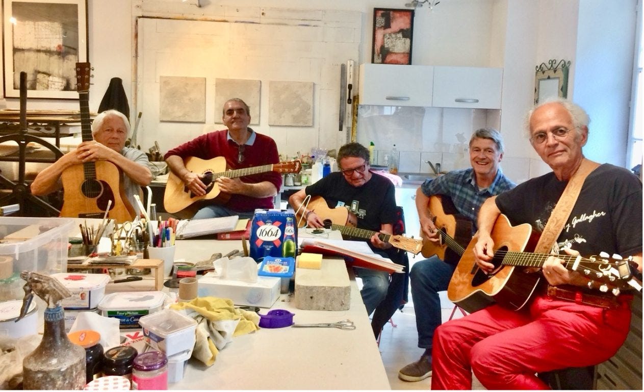 The next year in France, I found an excellent used Martin DX1 online at Leboncoin, and that’s what I play here now. We still return to Maine every summer, and my Guild awaits there. One day, I was walking home past the gallery of Bernard, a local artist in Seillans, my guitar case in hand. His English was not great, but he managed to ask if I played the guitar.